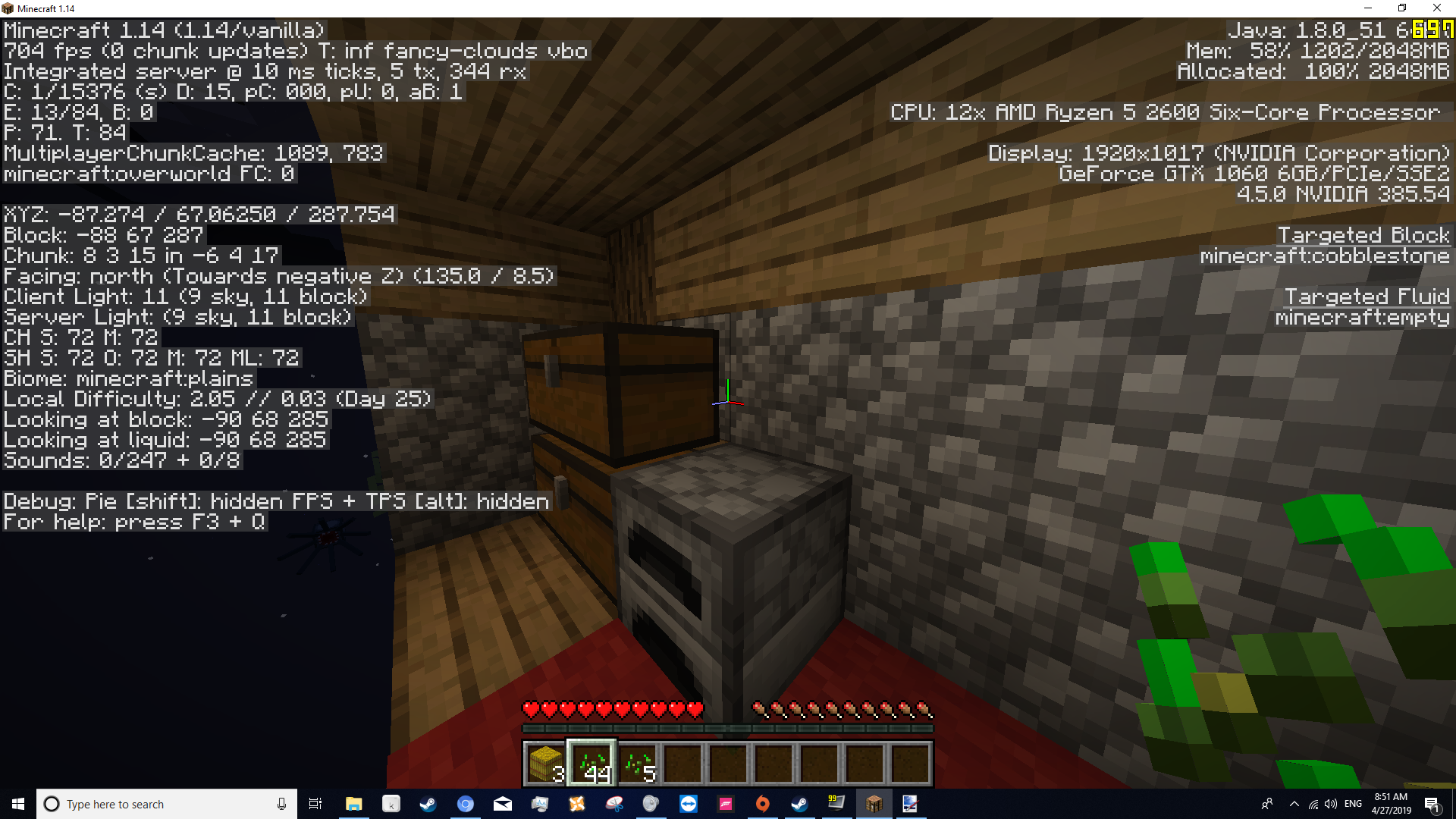 While playing on a world I made in version 1.13 in 1.14, I noticed a bug where terrain pops in and out of existance while clearly in the players view at some angles. I belive this is caused by looking directly at a block to the south while blocks in the north are still visible but I'm not entirely sure since this seems to appear in odd places. Another notable event is whenever this void is on screen my framerate jumps from about 350 to 700. See the attached files below for screenshots.