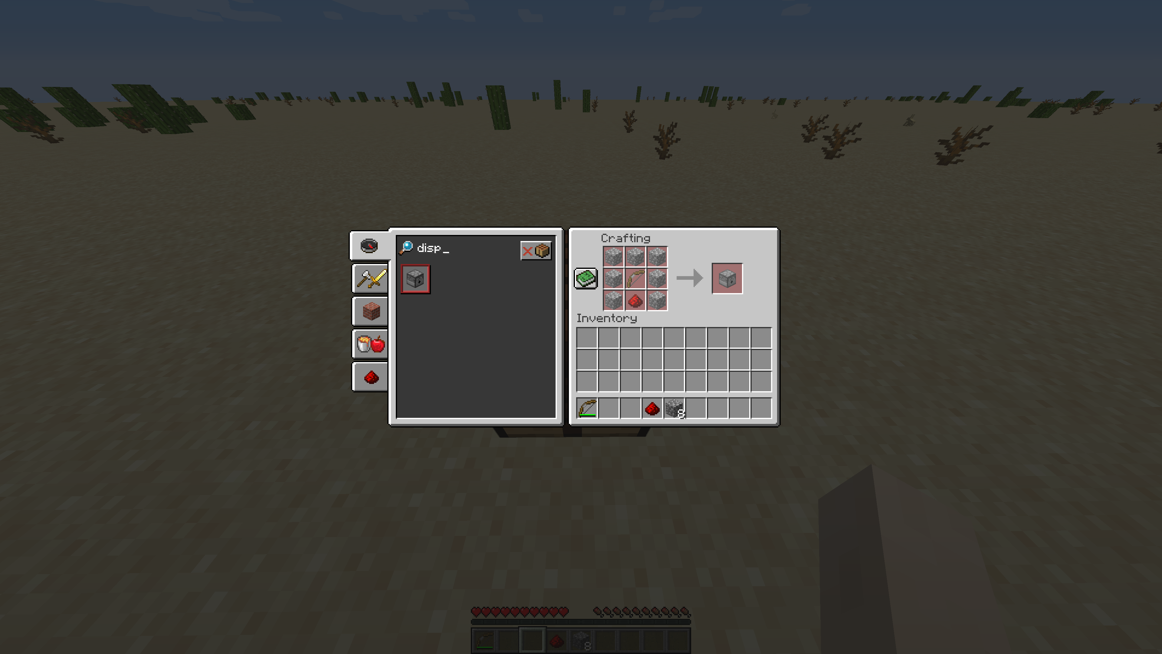 3. In theory, the dispenser should show up as craftable, since you have the materials required. In this case, it does not. Probably due to the recipe not recognizing that a damaged bow is allowed.