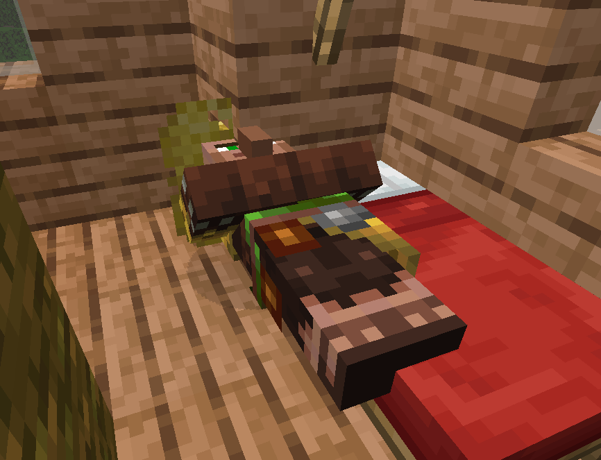 If you walk on top of a villager while it is sleeping it can be pushed around until it comes off of the bed. Once they are pushed off of the bed they wake up and don't go back to sleep. They just stand there.
