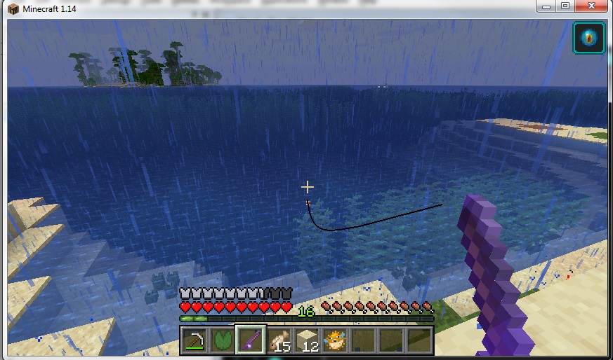 While fishing in the rain with conduit power from a wall the catch sometimes doesn't reach the player when pulling it in. At first it looked like something it flew off behind the player (after this happened a few times I found that it did indeed fly past 20 or so blocks) and twice it just dropped where the line was in the water.
