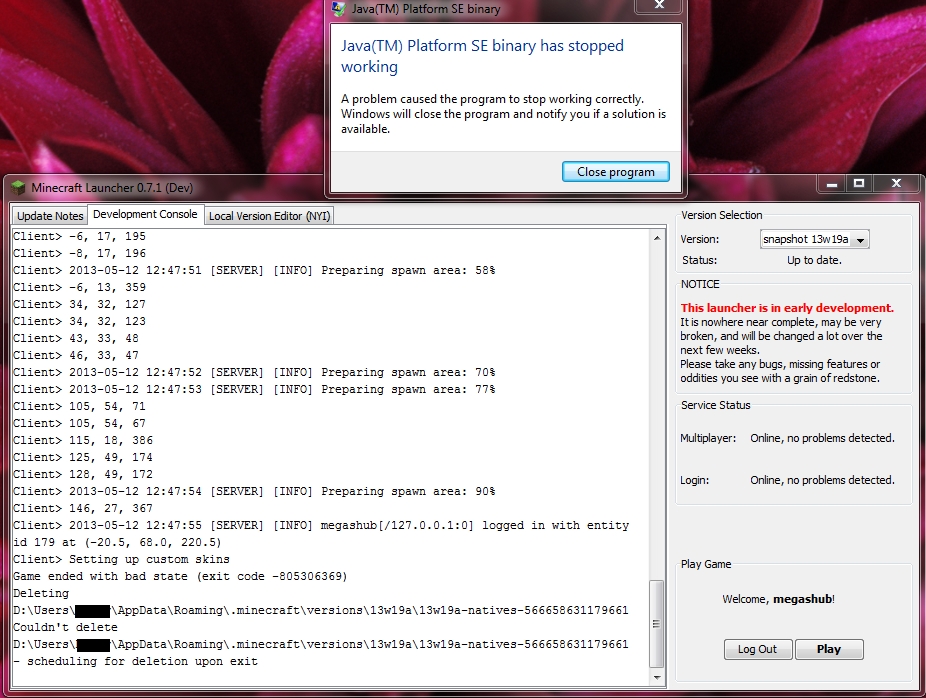 Couldn't delete D:\Users[user]\AppData\Roaming\.minecraft\versions\13w18c\13w18c-natives-3838676884402836 - scheduling for deletion upon exit
