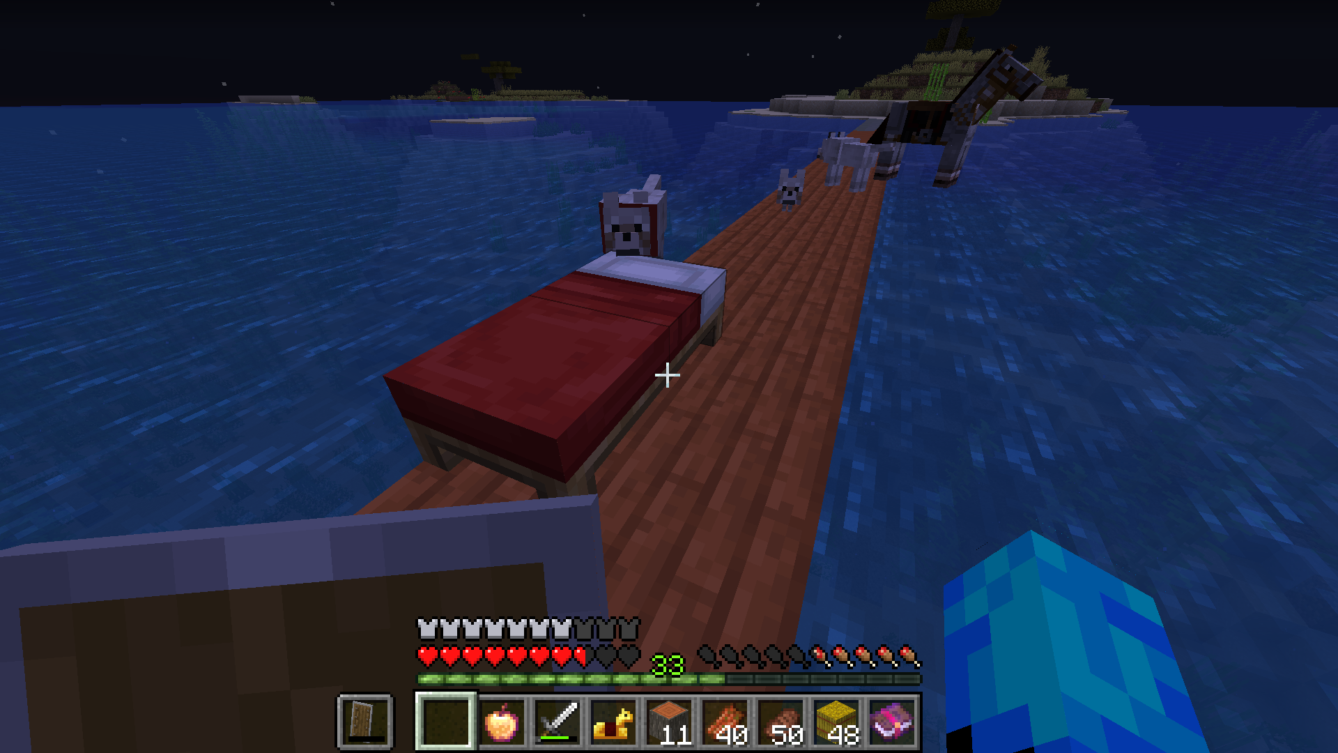 While I was riding a horse very fast (behind me was tame dogs, It was night and I wanted to sleep on a bed) I putted a bed (the dogs was very far away from me). When I putted a bed, in the same time dog teleported yourself into a bed place and the bed has disappeared. I thought that I have lost my bed but When I tracked the bed with the crosshairs and I clicked to a right mouse button, the bed was appear. I also mention that I was making a simple bridge and around me was the ocean. Mayby this was only one place for a dog to teleport to me. The photo below (2019-05-11_14.00.18.png) it is state after bug (before them, the bed was deasapeared and the bridge was shorter of course when I did this photo). This photo is for recreating this bug. The next photo is showing from where I was rding a horse(this is of course the beginning of the bridge).