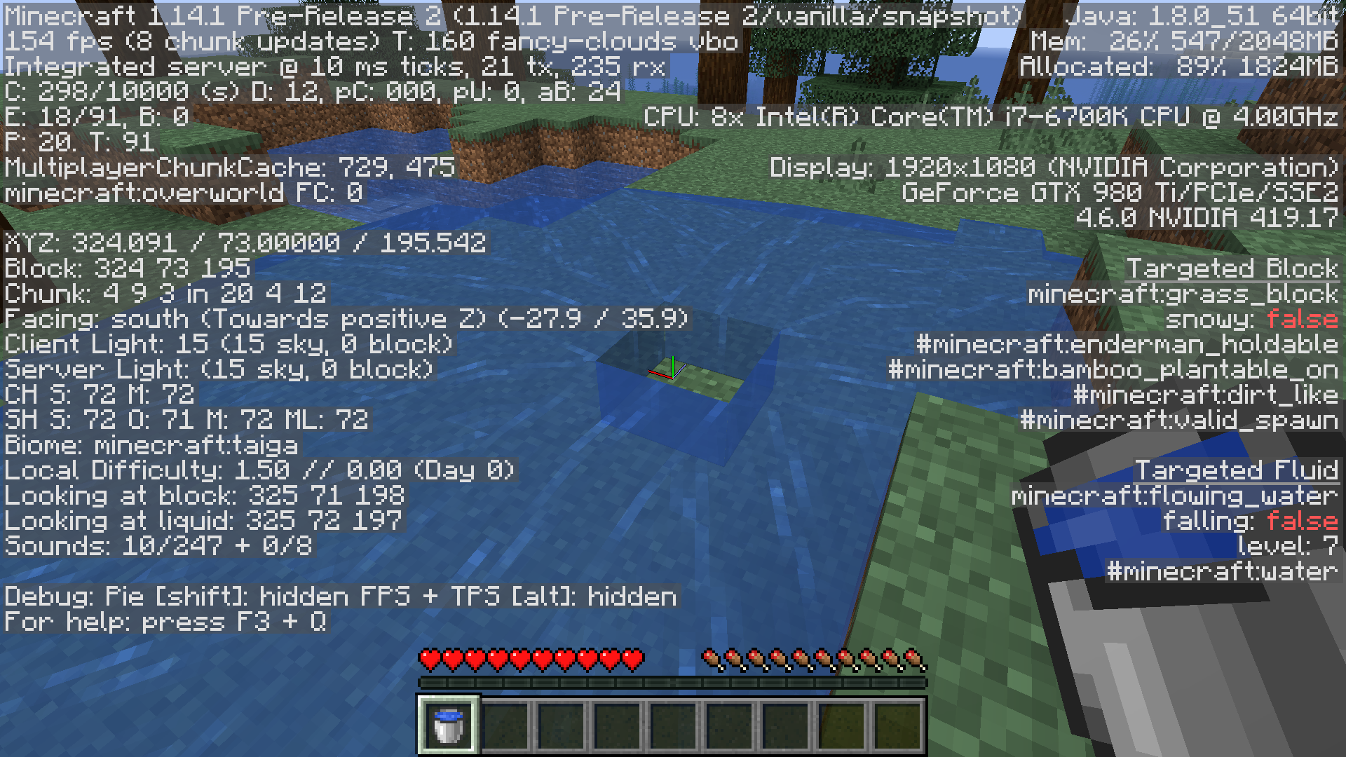 This bug occurs when quickly moving your mouse to pickup a water source block. The water source block is then invisible and is able to be picked up again. If you try to place the water bucket in your hand nothing will happen because the water was not picked up properly.