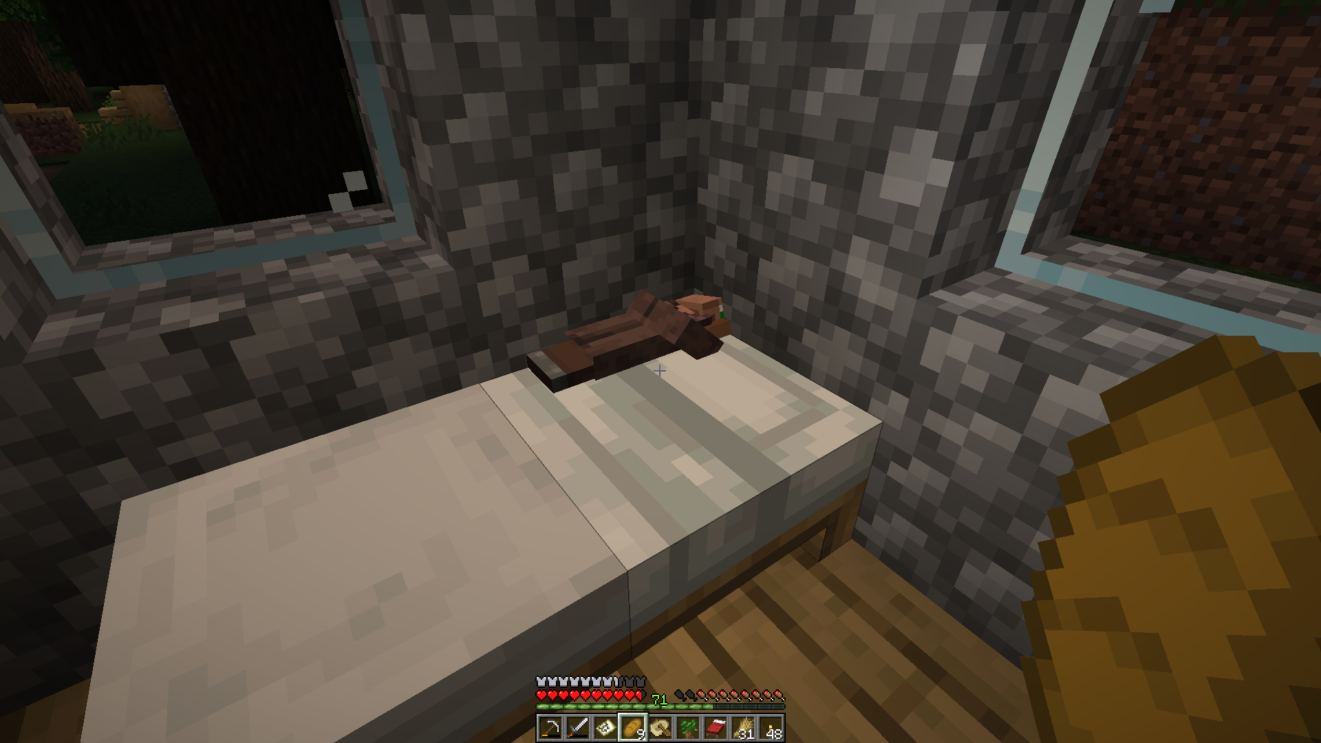 If a baby villager is sleeping in a bed, you may jump on the bed and walk in to them to push them around, they will go to the edge of the bed and into adjacent walls too.