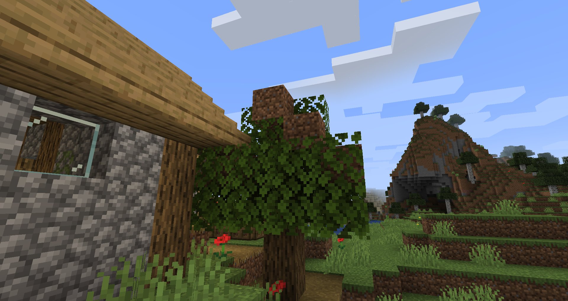 I was exploring and found a village. after a few minutes I noticed that there was dirt instead of leaves on part of a tree and realized that the path had replaced the leaves instead of the ground.