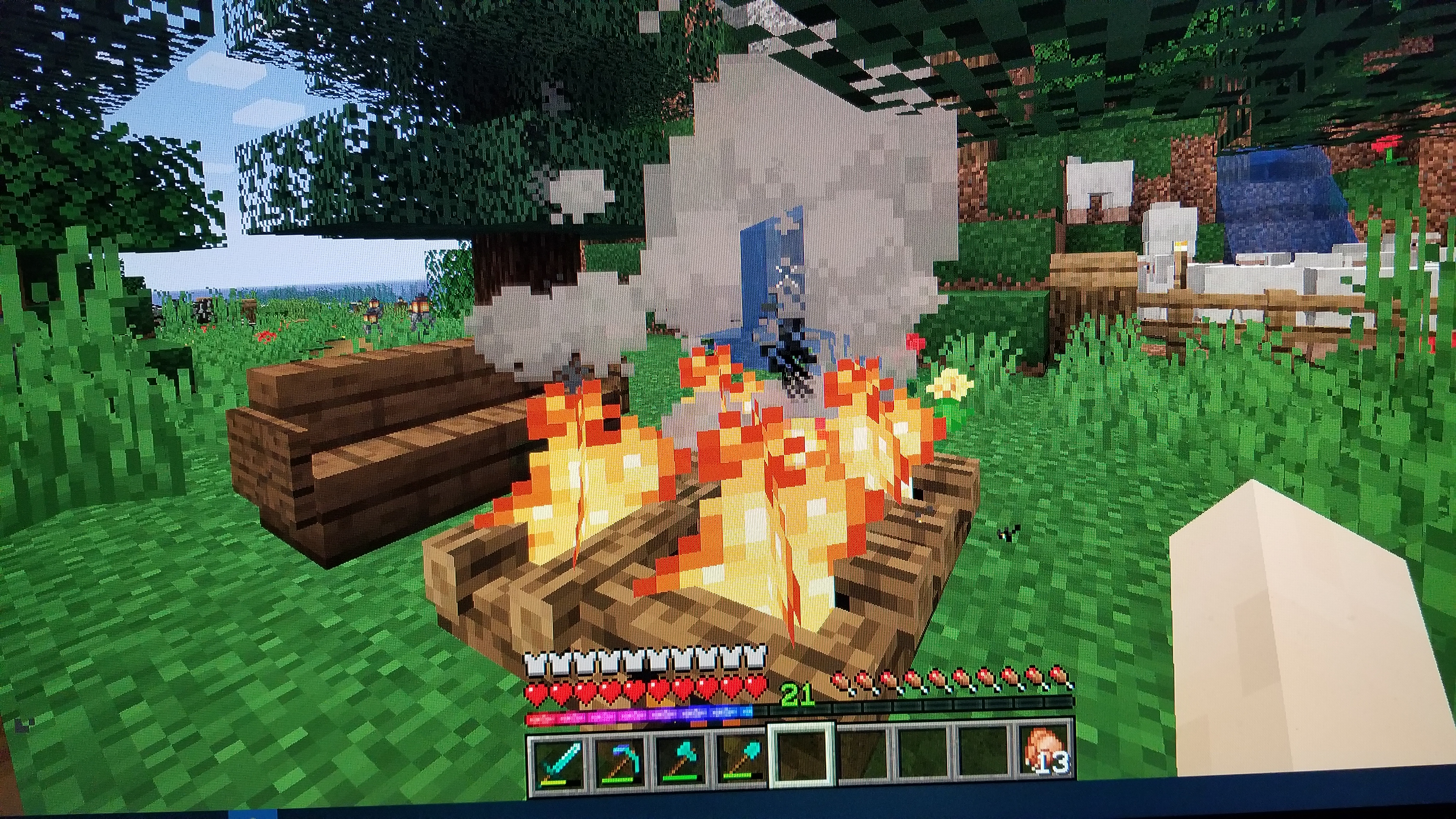 When placing a canpfire down in a position in which water is behind the smoke particles, the water is very clearly visible through the smoke particles. I've tested in a superflat world to see if the particles are supposed to be that transparent but considering the terrain behind the smoke particles isn't nearly as visible as the water, I figured this was a bug.