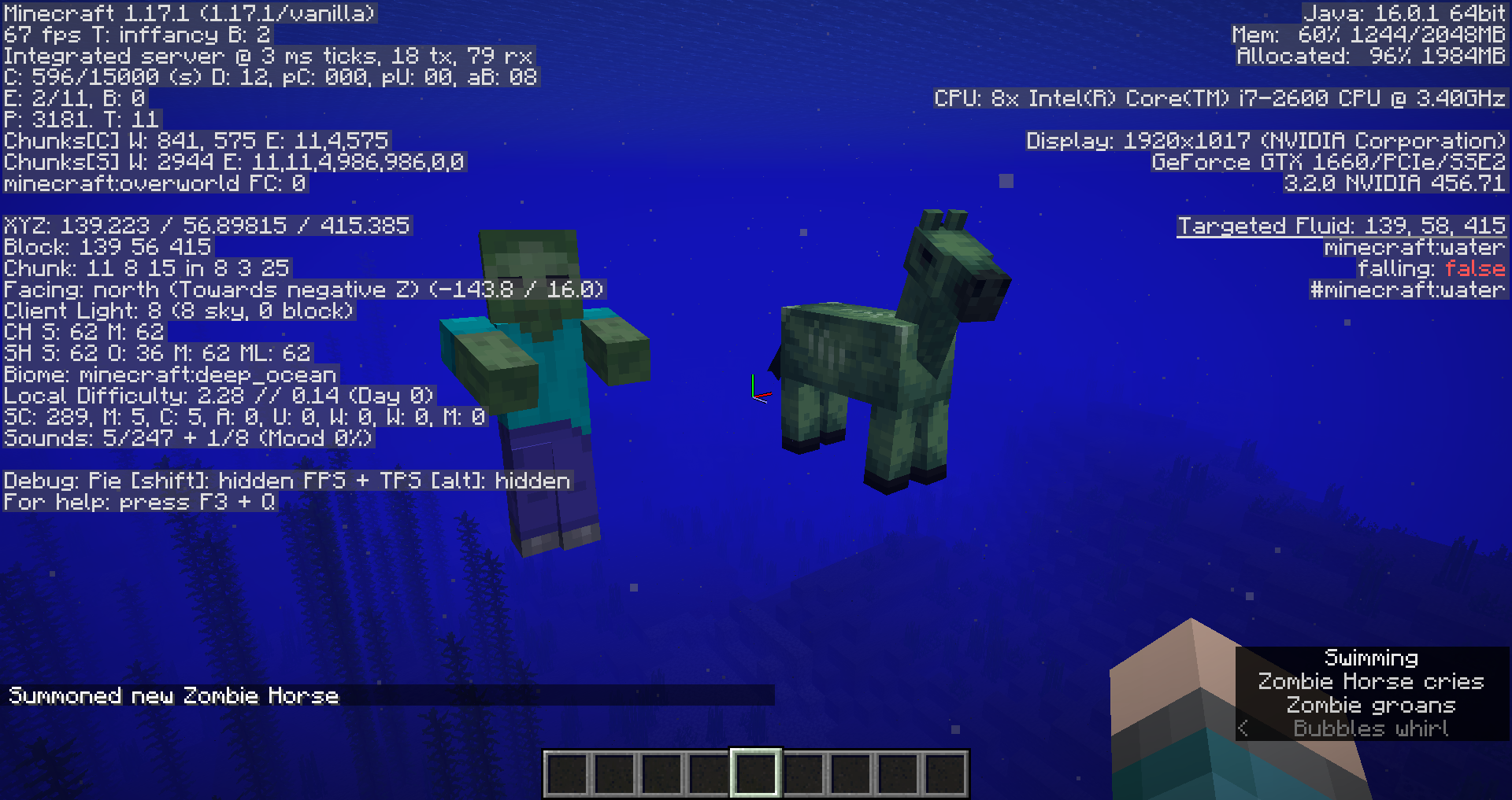 /summon minecraft:zombie_horse ~ ~ ~ {Passengers:[{id:zombie}]}→ ❌ Notice how the zombie dismounts the zombie horse when submerged underwater.