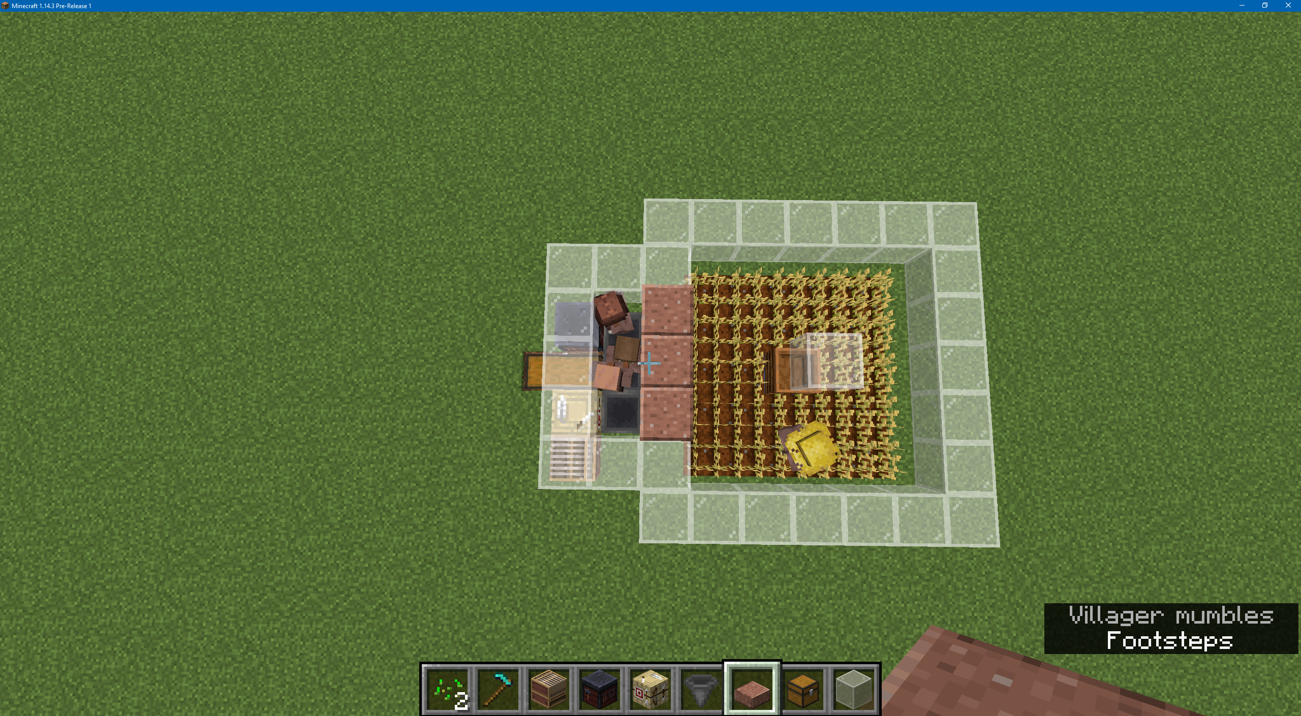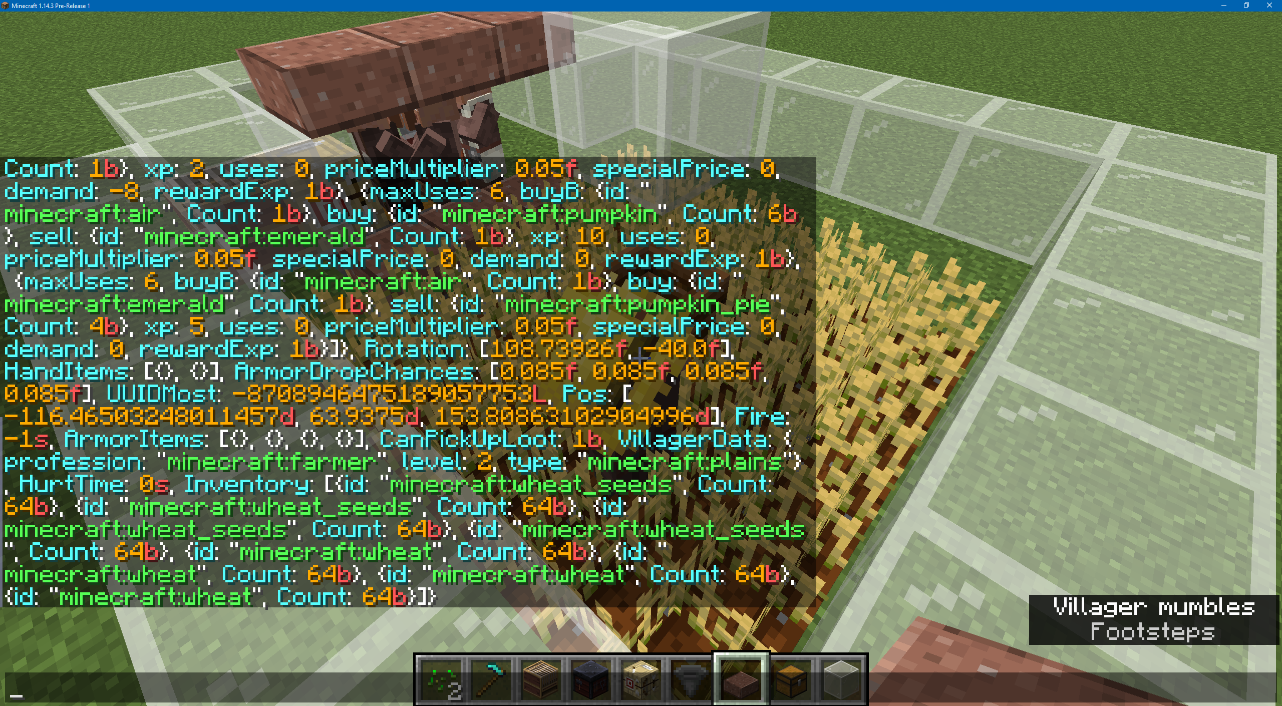 Mob griefing is set to true, so the villager is able to break crops. The first 4 inventory slots are filled with seeds, and the last 4 are filled with wheat. When the final slot contains wheat, the villager will no longer harvest crops. In prior versions, the villager would harvest, but not pick up the crops. (Note - I have also not seen the villager toss excess food to the other villagers in my test scenario, as well as the occasional farmland block left unplanted). This enabled farms to have hoppers, or hopper minecarts pick up the non-collected crops. The villager will replant if all the crops are harvested manually.