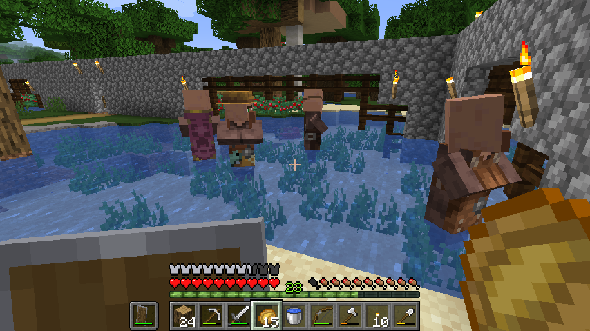 Upon backing up a world from 1.14.1 to 1.14.2, I noticed a strange issue with my Village. the Villagers get stuck in the water, we have tried pushing them out but they will just return in the water and spin. Iron golems also appear to have this issue, although they will just remain stationary and spin, or sink into the water.