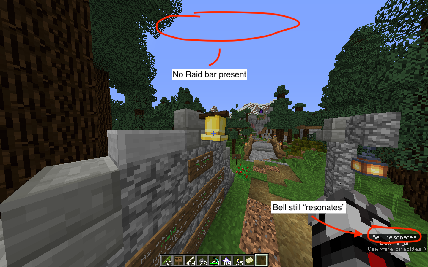 Hey there! Recently noticed this strange bug. While I was playing, I accidentally started a raid. In order to quickly cancel this, I switched to peaceful mode. By doing so, the raid bar disappeared (as it normally does) but when I switched back to hard mode, the bell (when rung) still resonated as if a raid was on-going.