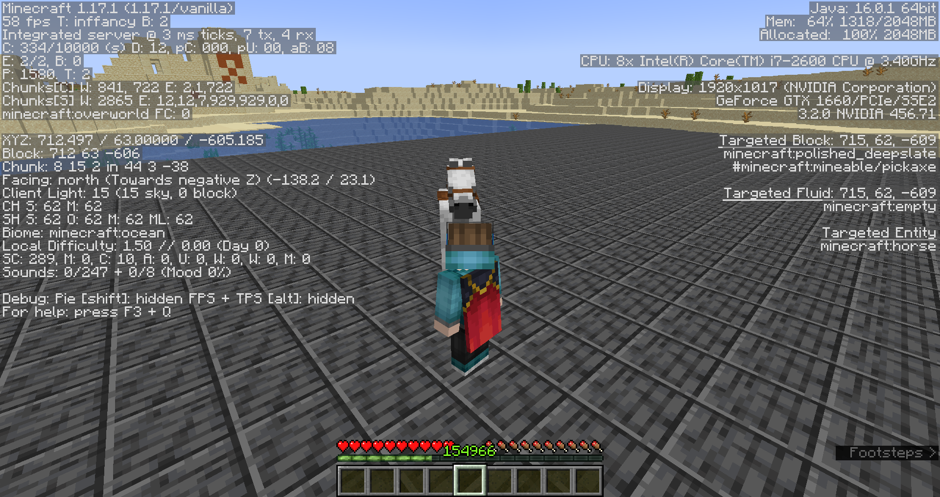 Actual: Only player's hearts and mount's hearts are displayed without the hunger bar, and on horses/mules/donkeys, the jump bar replaces the XP bar.