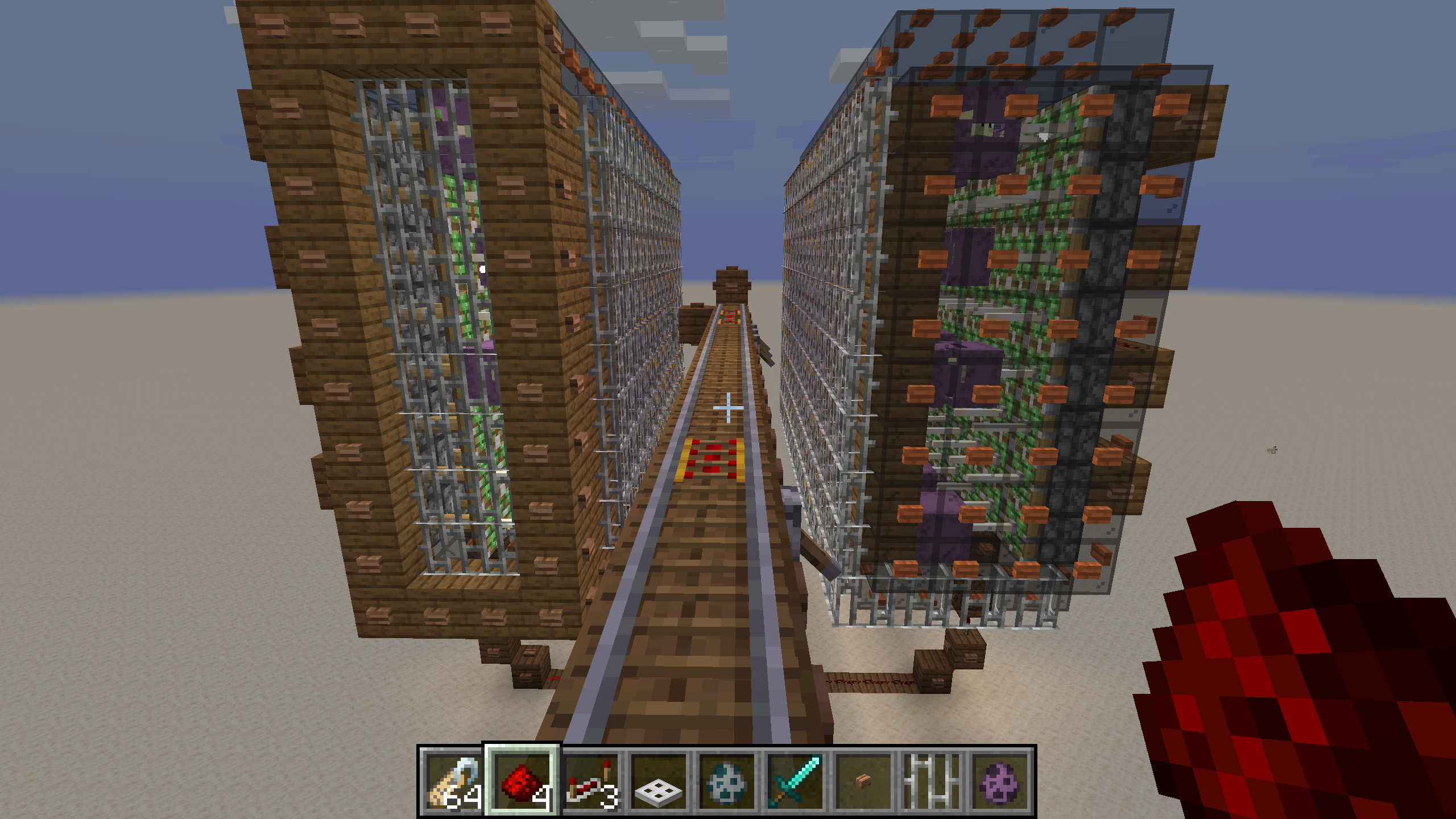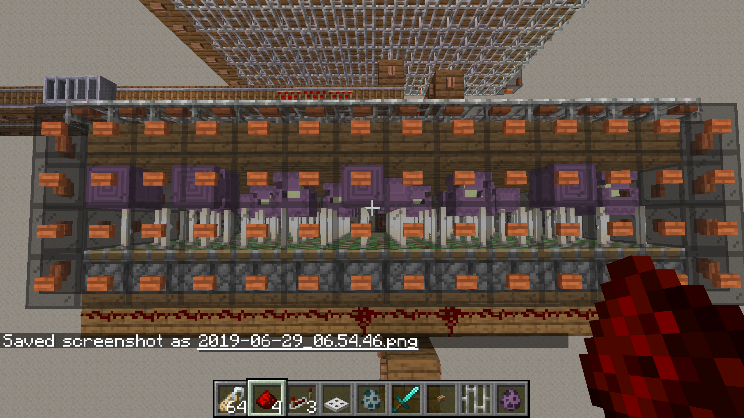 Screenhots show example of mob switch that worked prior to 1.14.3. It has two chambers where shulkers stay until pistons extend and put end rods into the shulkers head. Shots of each chamber show shulkers with end rods in their heads not teleporting to valid positions in the second chamber as they would be in a 3x3 area centered on another shulker.
