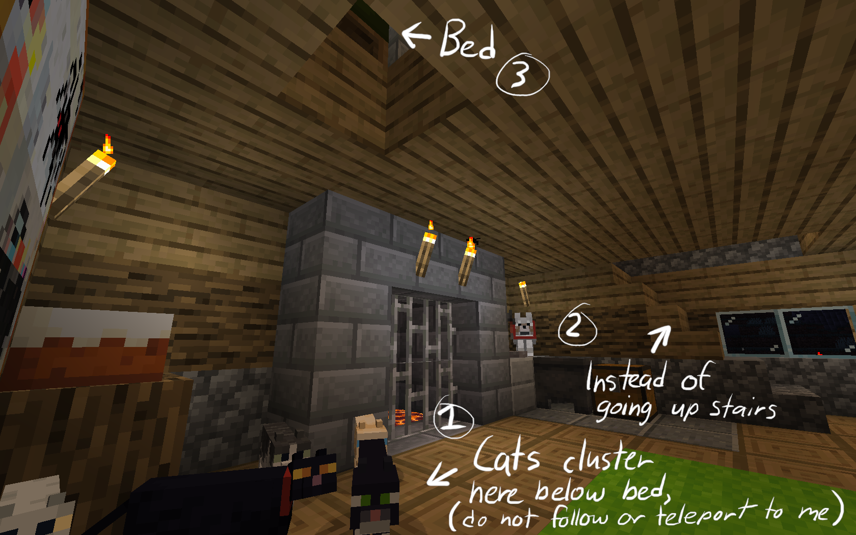 Ok, so I found a cat, and tamed it. Now when the cat is in ur house, and is not demanded to sit down, they will most likely sit on a chest or sit on the bed. The cat is naturally attracted to the bed. So this is where the problem occurs. I was making a basement for my house, and my cat got down in the basement. And it stayed anchored to the corner of the basement, i was wondering why. I knew the cats liked being on the bed, so i moved my bed upstairs, and for sure it followed. So the cat is attracted to the coords the players bed is sitting on, even if it is below the bed, or above. Only way to get it out of the basement is buy breaking the bed, and getting the cat to teleport to me. I am running The latest version of minecraft, and all vanilla. Only thing different is that i have a shaderpack on. I posted a unlisted video to youtube explaing the problem, since you can tell much from screenshots. Please fix this bug. Thanks.