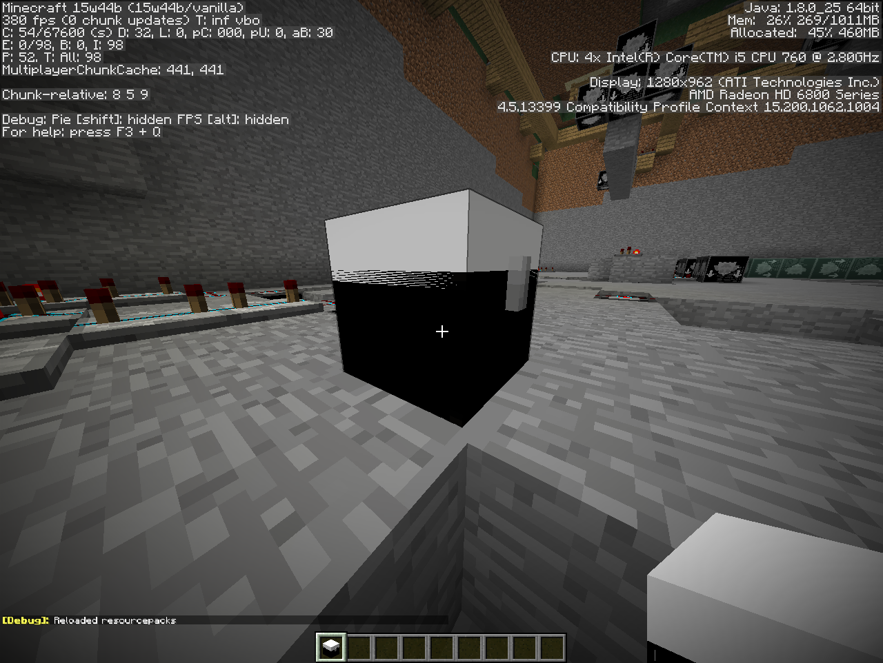 Minecraft 1.4.2, Minecraft 1.4.6, Minecraft 1.4.7, Snapshot 13w03a, Snapshot 13w04a, Minecraft 1.5.1, Minecraft 1.5.2, Minecraft 1.6.2, Minecraft 1.6.4, Minecraft 13w38a, Minecraft 13w38b, Minecraft 13w38c, Minecraft 14w08a, Minecraft 1.7.5, Minecraft 14w10b, Minecraft 14w10c, Minecraft 1.7.10, Minecraft 14w30c, Minecraft 14w31a, Minecraft 1.8-pre3, Minecraft 1.8, Minecraft 1.8.1, Minecraft 1.8.3, Minecraft 1.8.7, Minecraft 1.8.8, Minecraft 15w39c, Minecraft 15w40a, Minecraft 15w40b