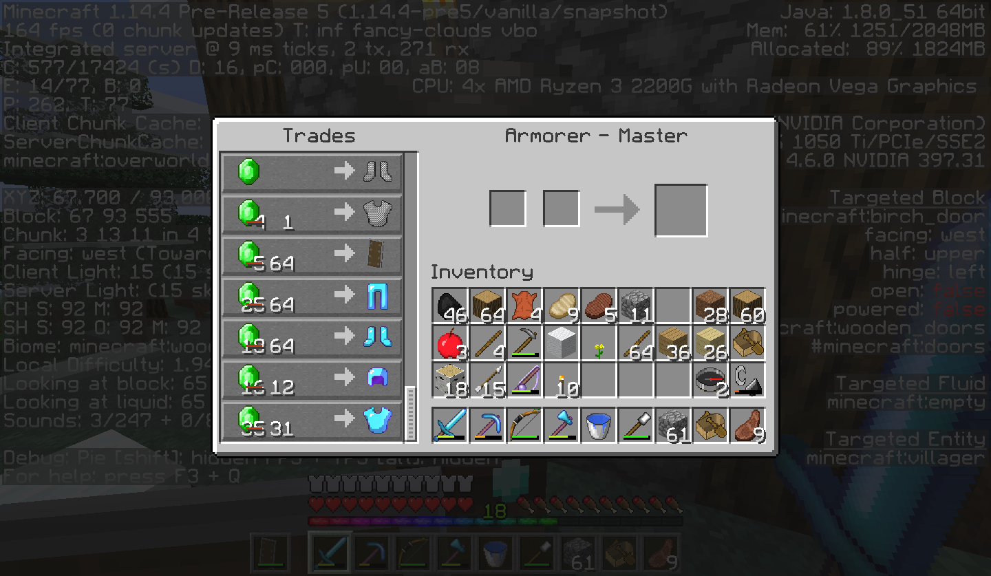 After buying a ton of 1-emerald shields, my master-level villager upped their trade to 64 emeralds for one shield. This seems like a very drastic jump, considering one shield normally sells for 5 emeralds. The other trades the villagers offer also jump to 64 emeralds once I buy two or more items (In the images below, I bought the leggings and boots twice and the helmet and chestplate once – the items I bought twice jumped to 64 emeralds while the rest went up only slightly.)