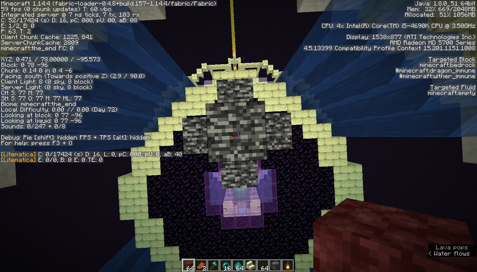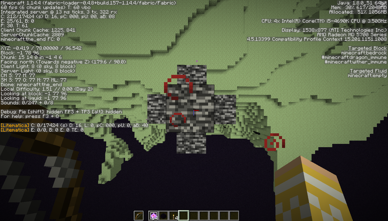 So, in my last post regarding this, I was told that what I was trying to do was suggest a feature change, but that is not the case. I went back to older worlds, specifically the world that I made something in The End on (The version of this world is 1.12.2). I had killed 20 dragons, and I went to check everything. Everything then and there was symmetrical, in regards to the end gateways. Then I went to try and make another world, this time in 1.14.4, killed 20 enderdragons, and checked it out. The portal at X 1 to -1, Y 74 to 77, Z -95 to -97 was the same, but when I went to check the other one, the coordinates had shifted (not like it changed in the same world, as said, this was a new world). The coordinates were X=0 to -2, Y=74 to 77, Z=95 to 97. I suspect that this is a bug that has happened in 1.14(though could be 1.13 too, haven't tested that one), but none the less, this is a change that is so minimal, that I refuse to believe that it is intentional, therefore I am reporting it as a bug. I will be providing screenshots in regards to the issue. The screenshots where you can see something has been built on is the 1.12.2 world, and the one where you just see end gateways is the 1.14.4 world. If there are any confusions, I will be happy to explain, but please do note that what I am requesting in not a feature change. I have no way of saying that it is a bug, but it's a change between versions that is stated nowhere, and is of such a minimal caliber, that I deem it to be a bug. Also, Fabric, and the mod I installed, changes nothing about world generation. The mod is LiteMatica, and Fabric is just a mod-loader.
