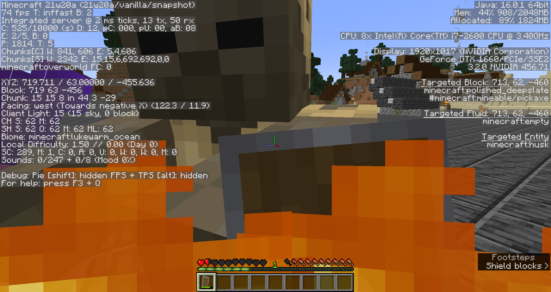 /summon husk ~ ~1 ~ {HandItems:[{Count:1,id:wooden_sword,tag:{Enchantments:[{id:fire_aspect,lvl:2}]}},{}]}Get a shield