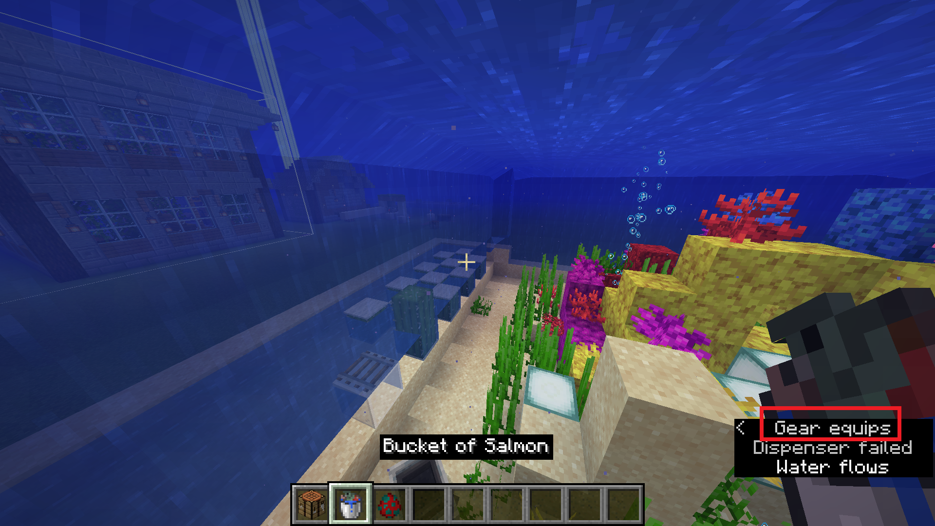 Subtitle shows "Gears equips" when catching a fish (all 4 kinds) with a water bucket, though the catching sound and wearing gears sound are easy to tell their differences. The screenshots show one example when you catch a salmon. The detail has been marked in the second screenshot.
