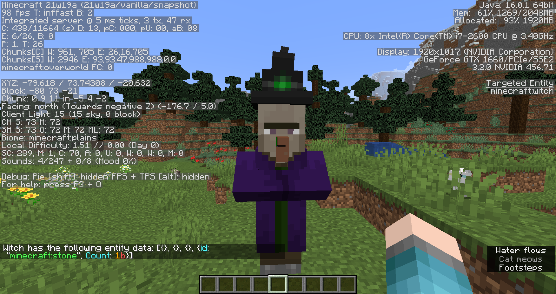 /summon minecraft:witch ~ ~ ~ {NoAI:1b,ArmorItems:[{},{},{},{id:stone,Count:1b}]}