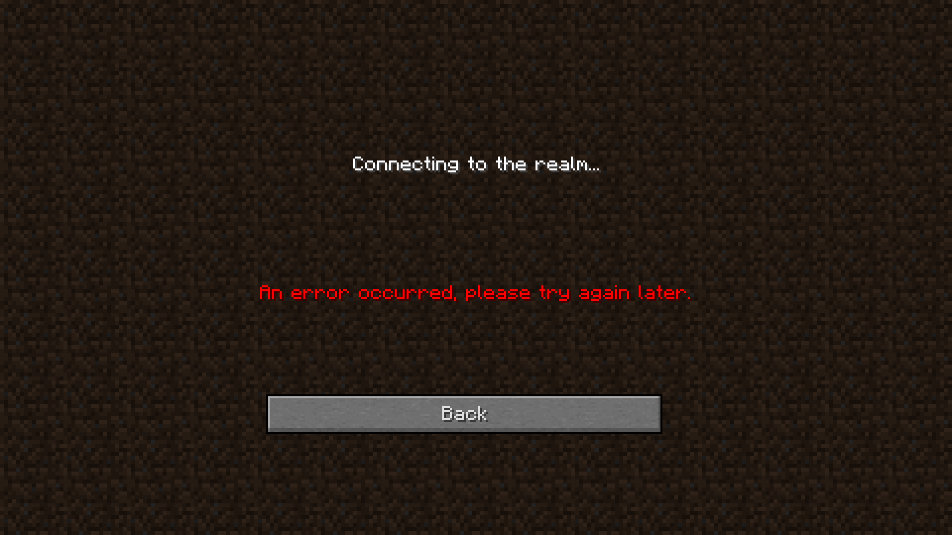 I've been trying to connect to my realm for almost two hours. The game goes to the Realm loading screen and after a couple minutes says "An error occurred, please try again later."
