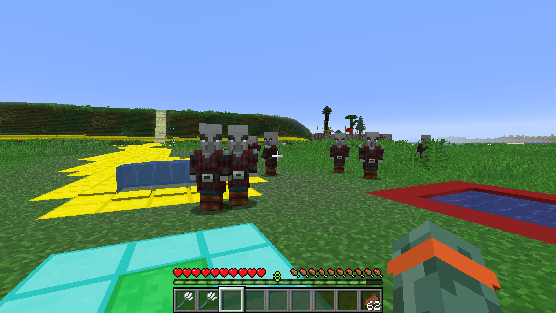this was produced with the pillagers not on my team with the command /summon minecraft:pillager ~ ~ ~ {}. they still do not attack even when attacked themselves, and ignore villagers. I rate this as low priority because this is not likely to happen in the game without commands, however can potentially get in the way of some.
