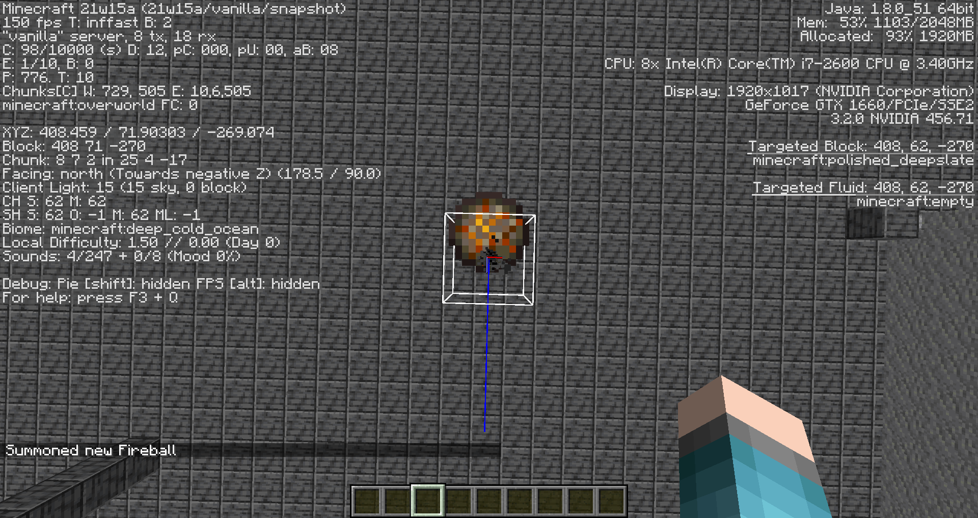 /summon snowball ~ ~ ~ {NoGravity:1}and look straight downwards. You would expect your crosshairs to be pointing at the center of the snowball, but the bug makes the snowball look like it's slightly higher.