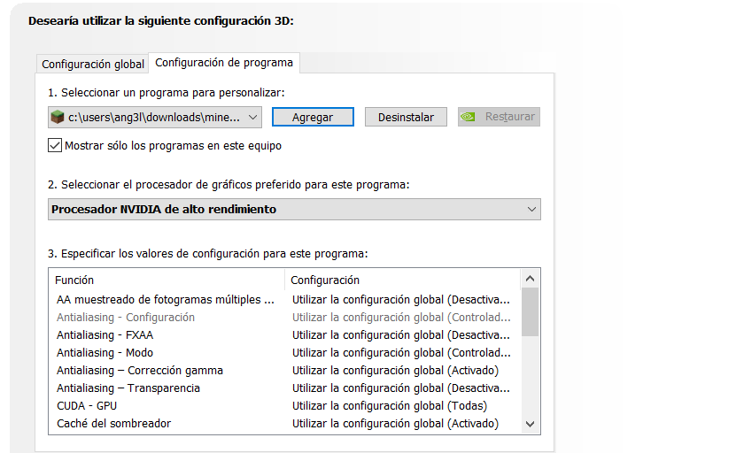 Agrego el launcher a la misma configuración, agrego el archivo java, tambien intente apuntando al JRE de Java y configurando ese para que fuera ejecutado con los gráficos dedicados y nada me funciono. El juego se sigue ejecutando con el gráfico dedicado.