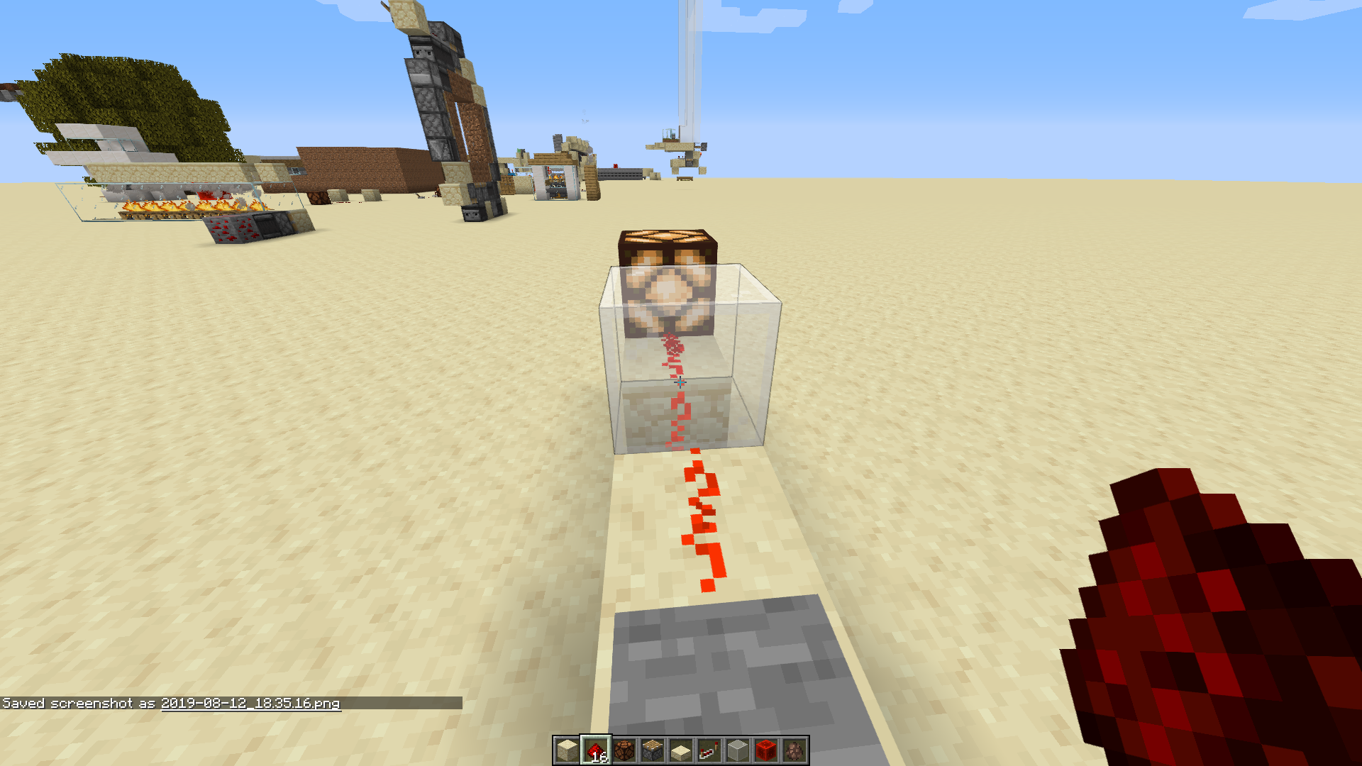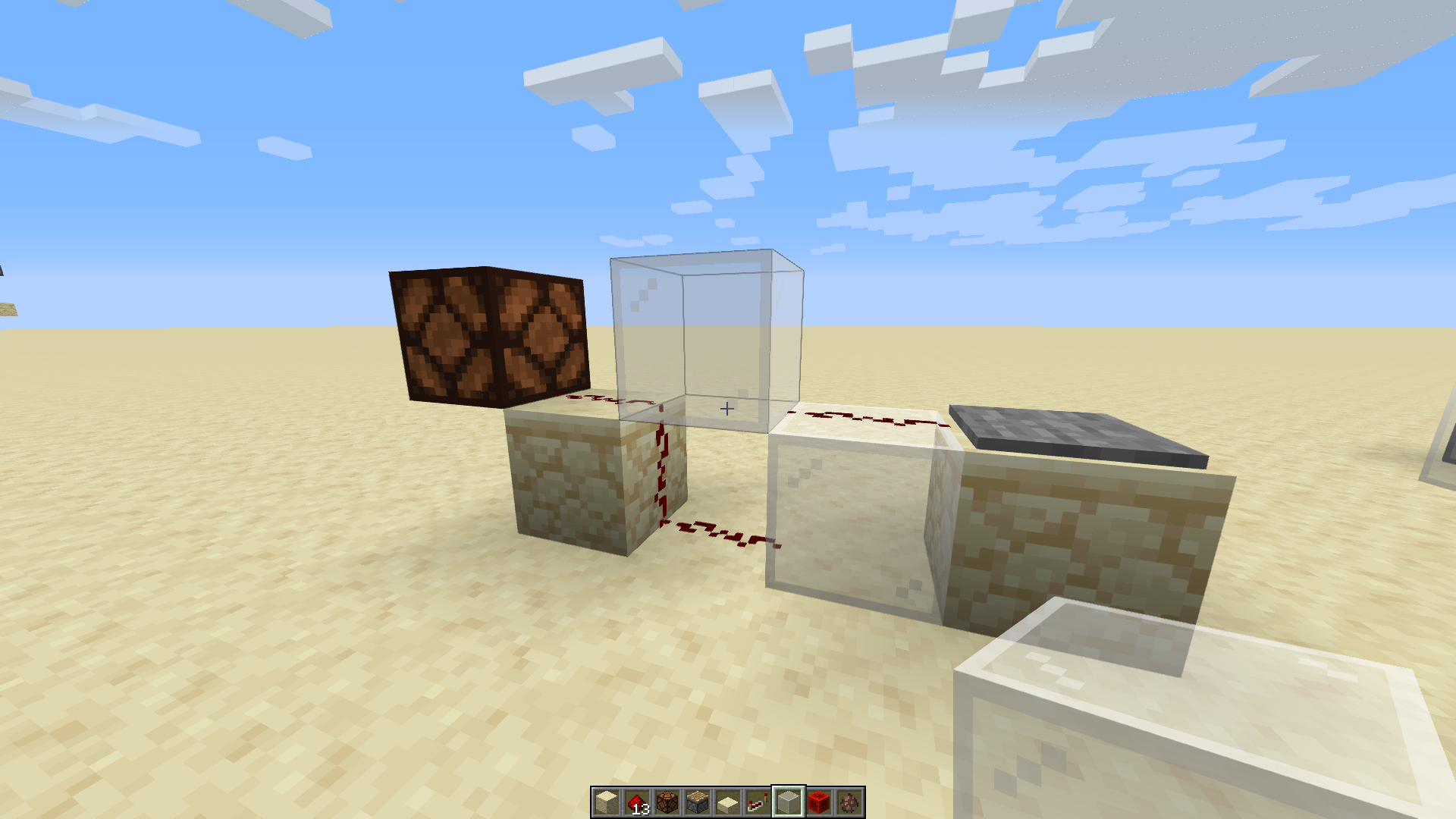 Replace the glass with redstone on top with a solid block with redstone on top and observe the redstone lamp is lit up.