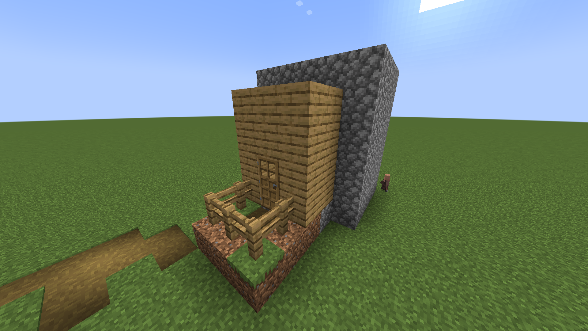 Build a house in a village like in the screenshots. Give yourself the Bad Omen effect, and spawn a Vindicator in the fenced area to immediately stop the raid from becoming bigger.