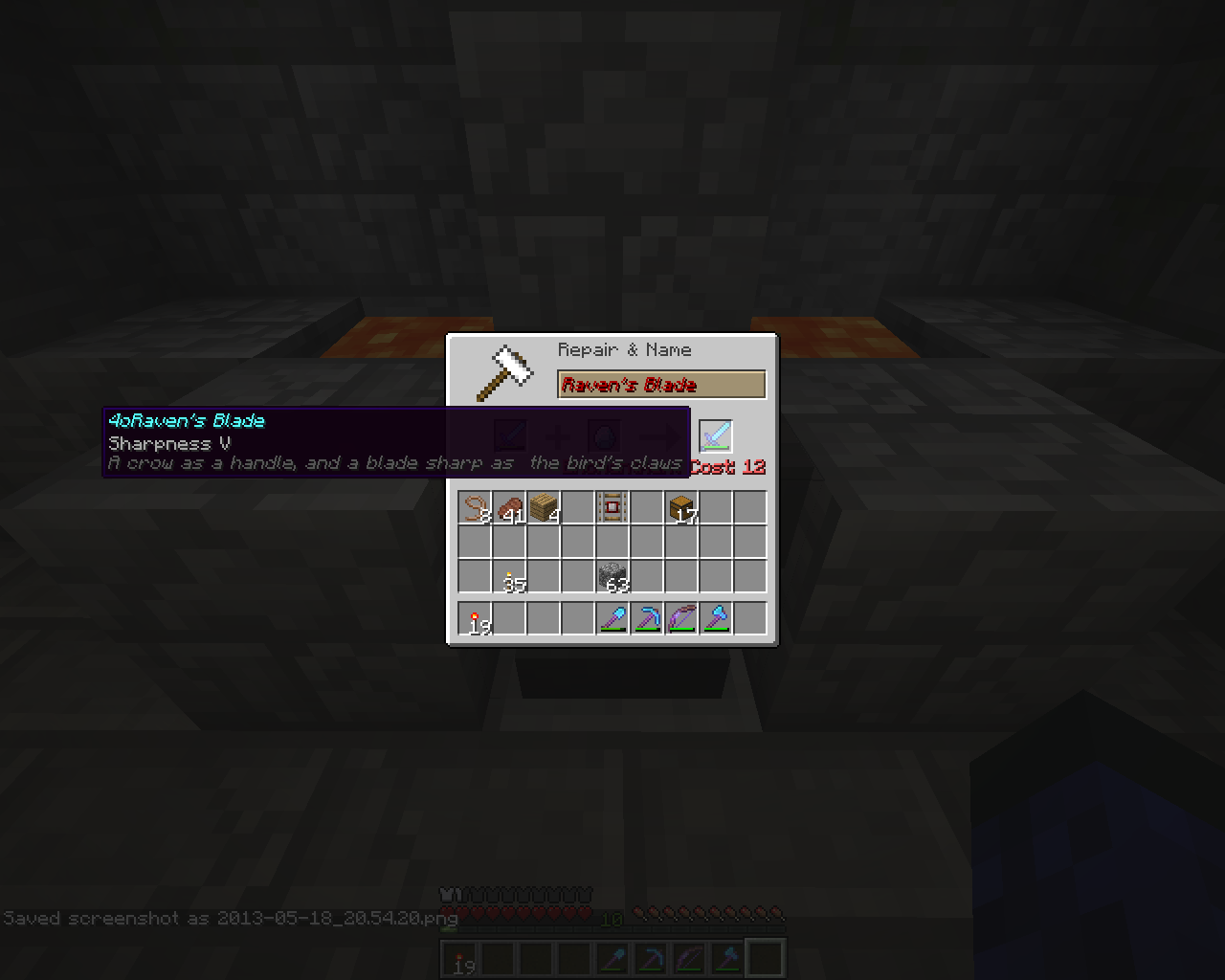 Back in the game, when trying to repair the item using an anvil, the repaired item can't be taken back from it's slot to your inventory and it doesn't keep its color ie it shows "4odiamond sword" from a sword wich had a red name.