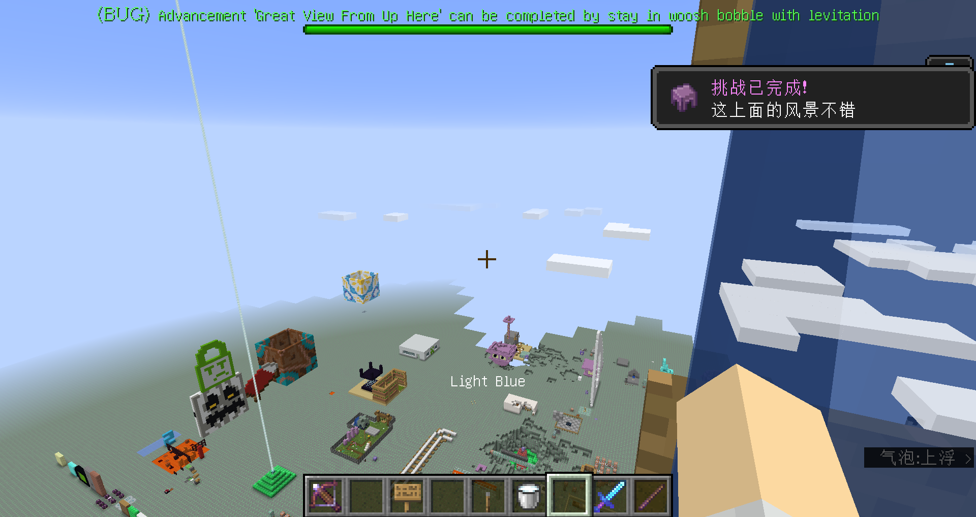 The 'Great View From Up Here' advancement is granted even if not the complete vertical distance has not been travelled by levitating. For instance, it can be granted as well when throwing an ender pearl, or by using a bubble column while under the levitation effect.