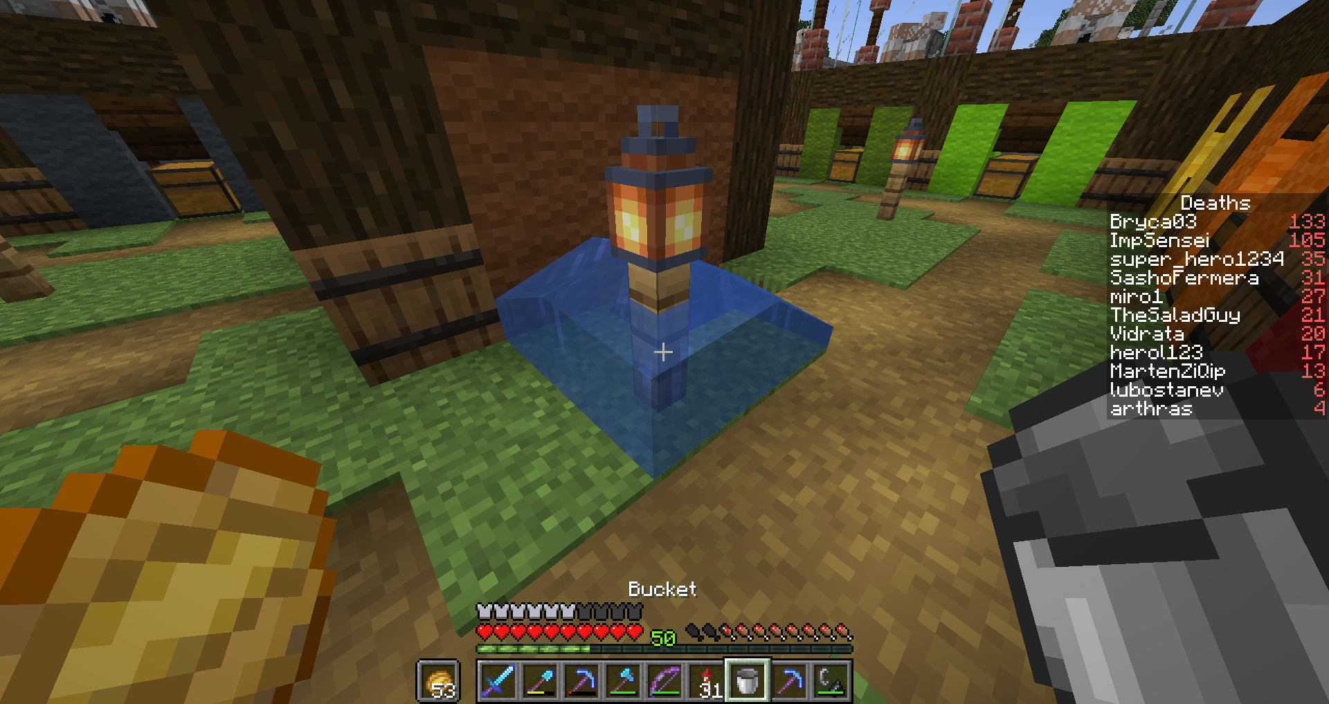 It's a rather hilarious bug, but I can place water sources inside the following: Chests, Ender chests, Trapped chests, Double chests, Fences, Slabs, Stairs, Scaffolding, Trapdoors, Ladders, Walls, Signs, Campfire, End Crystals. Lava does not have the same issue. Tested on both version 1.14.4 and snapshot 19w36a in Singleplayer and Multiplayer. Attached pictures are from Multiplayer.