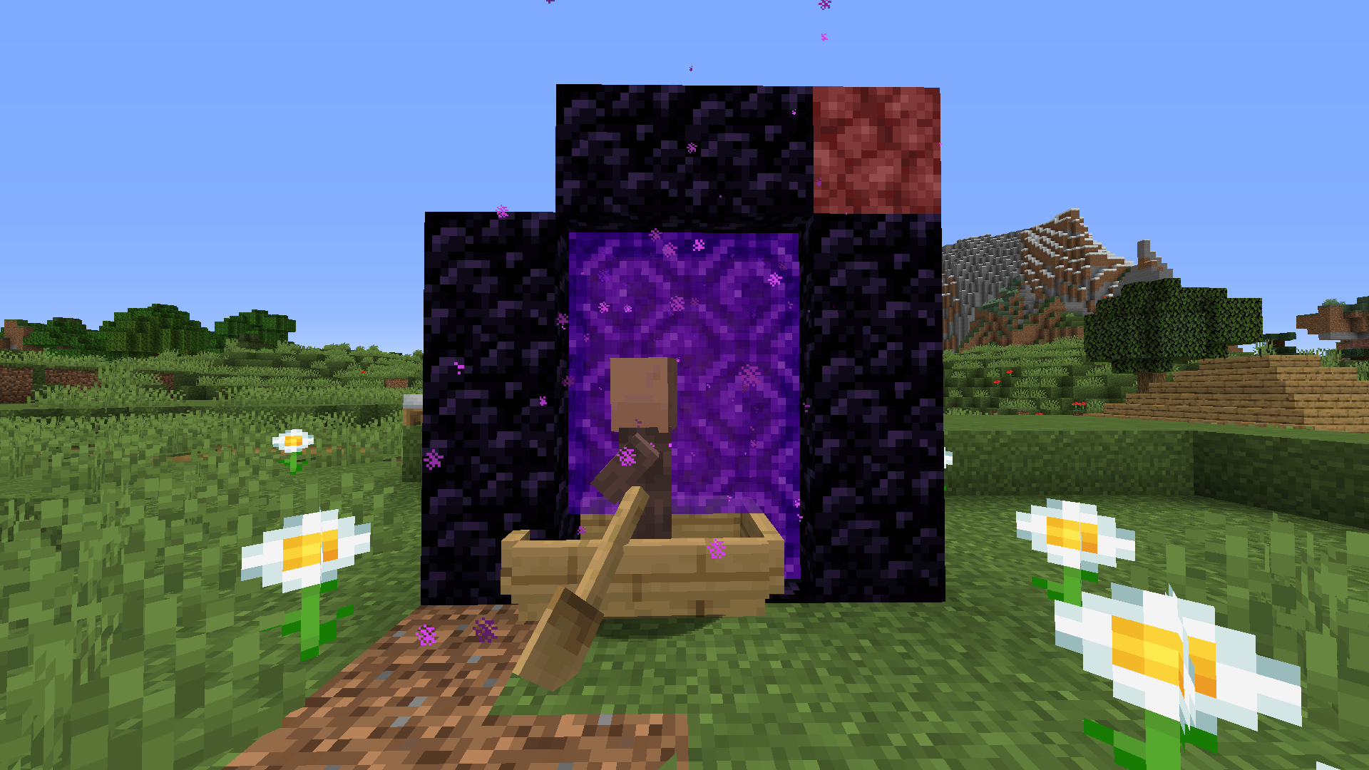 The villager turns black with its head stuck in the portal ceiling, taking no damage. The entire game freezes for a moment, then the villager phases through the ceiling and lands on the ground, clearly still in the overworld. The boat always travels through, meaning the problem is with villagers specifically and not with general portal-entity interaction.