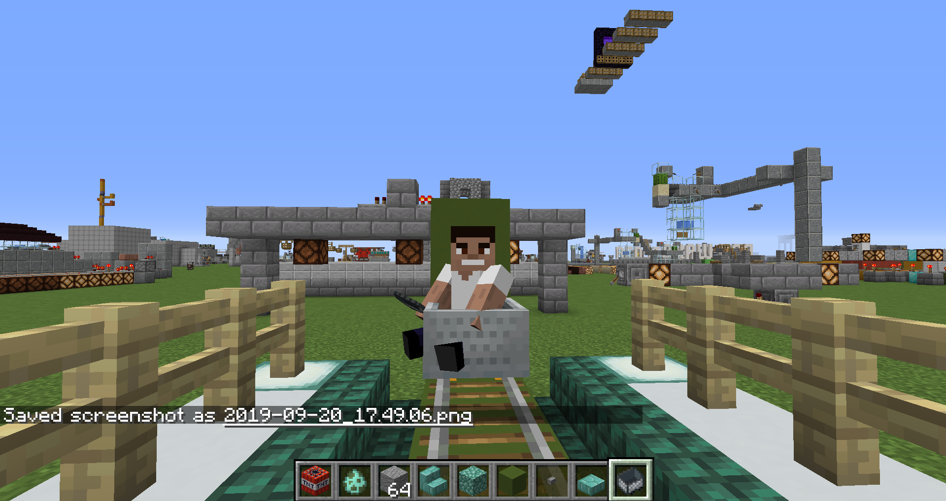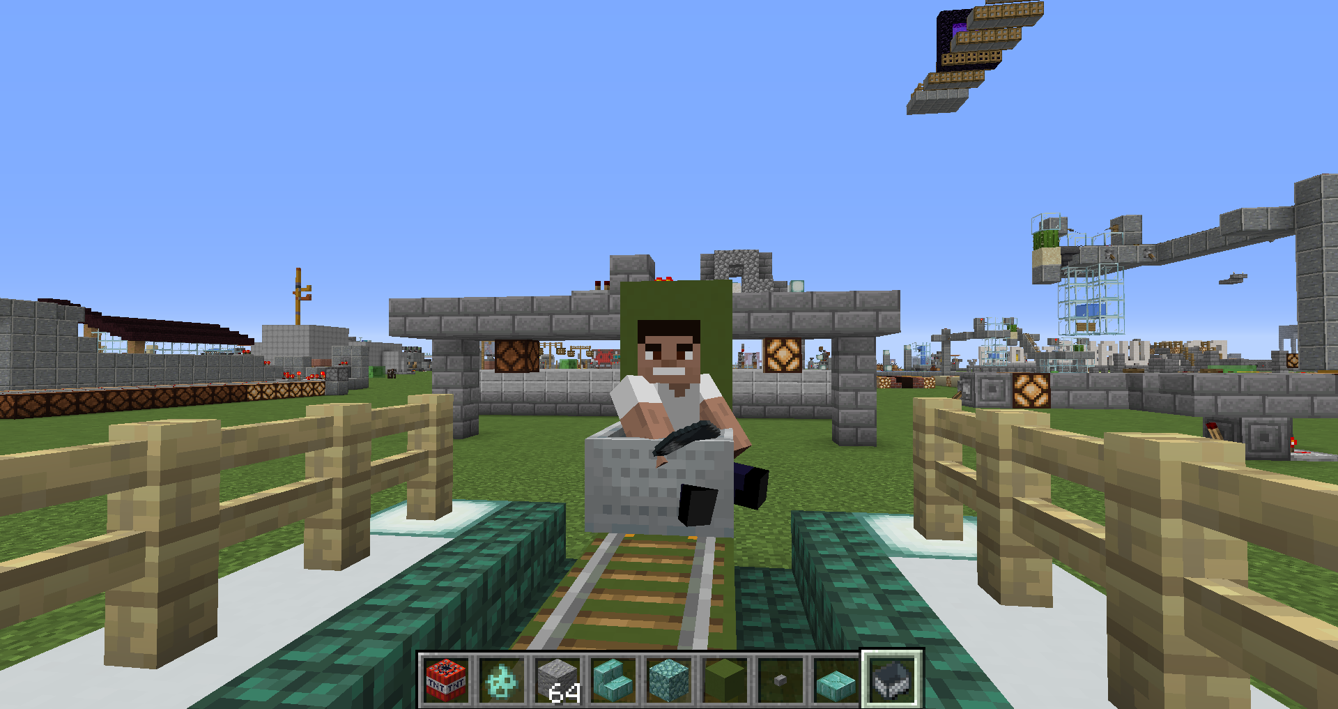 4. Place a minecart on the minecart tracks and get into the minecart.