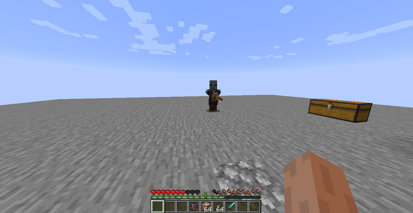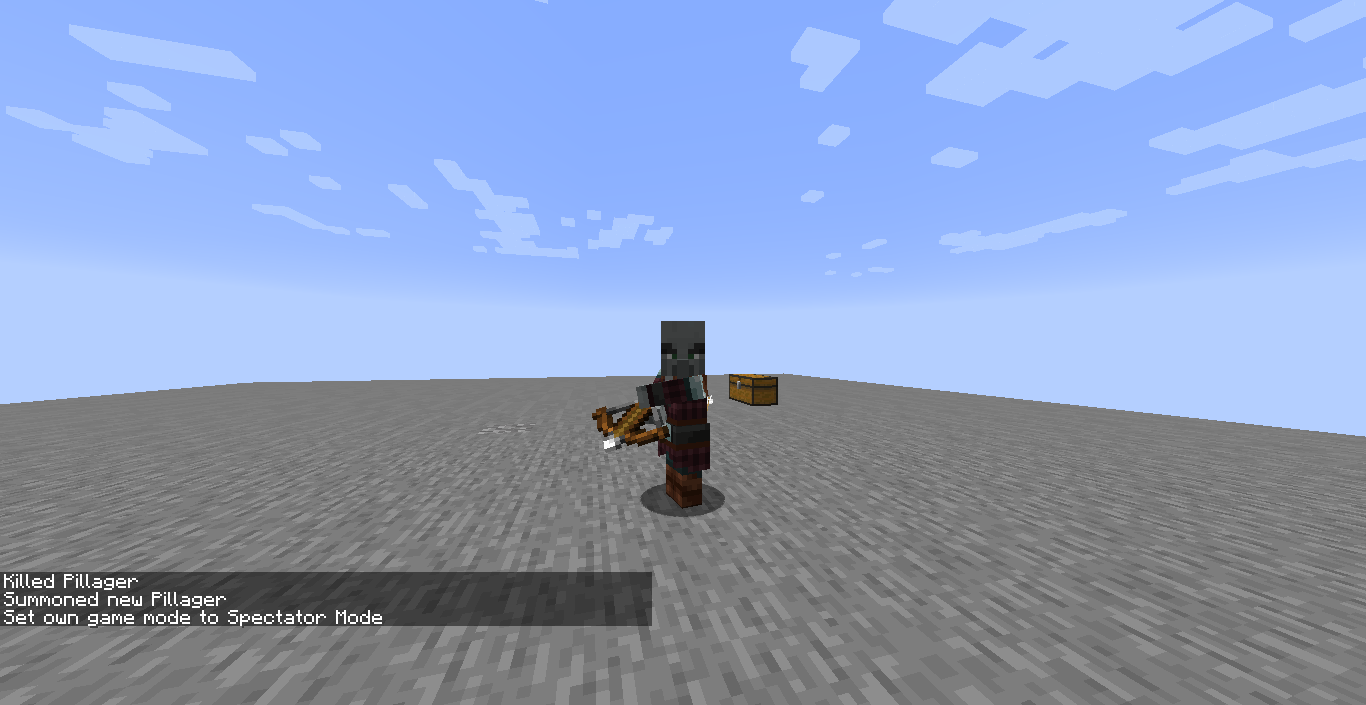 /summon pillager ~ ~ ~ {HandItems:[{id:crossbow,Count:1b, tag:{ChargedProjectiles:[{id:"arrow",Count:1b}],Charged:1b}}]}Switch gamemode to survival
