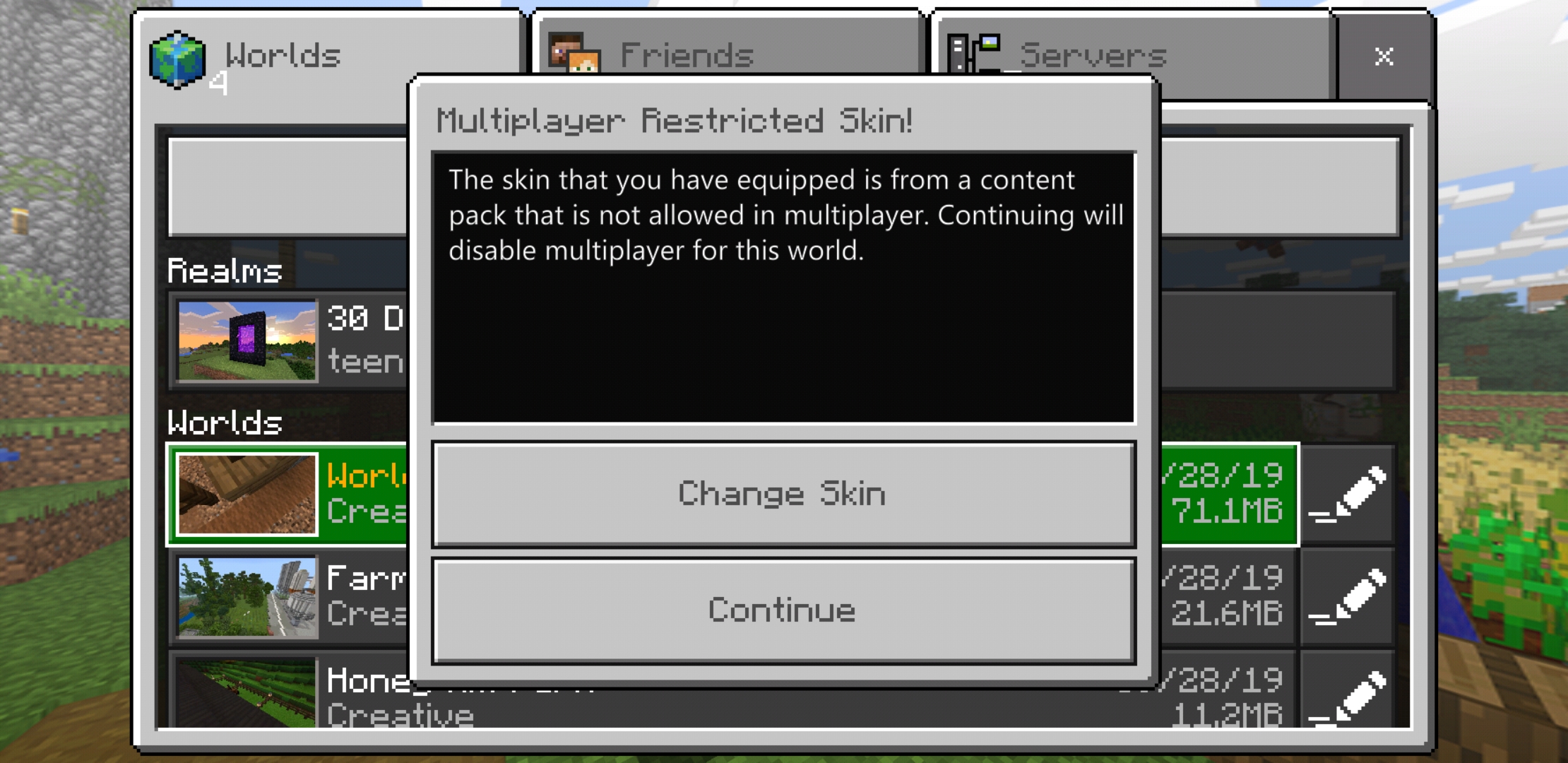 The skin that I equipped is from a content pack that is not allowed in multiplayer. Continuing will disable multiplayer. I dont have multiplayer on in the worlds I play.