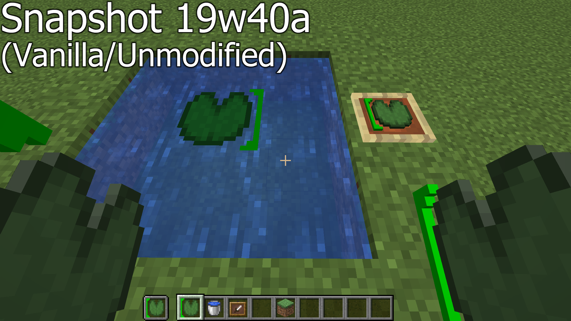 Place the Lily Pad on top of the water, and compare the placed Lily Pad to the one in the hotbar and in your hand.