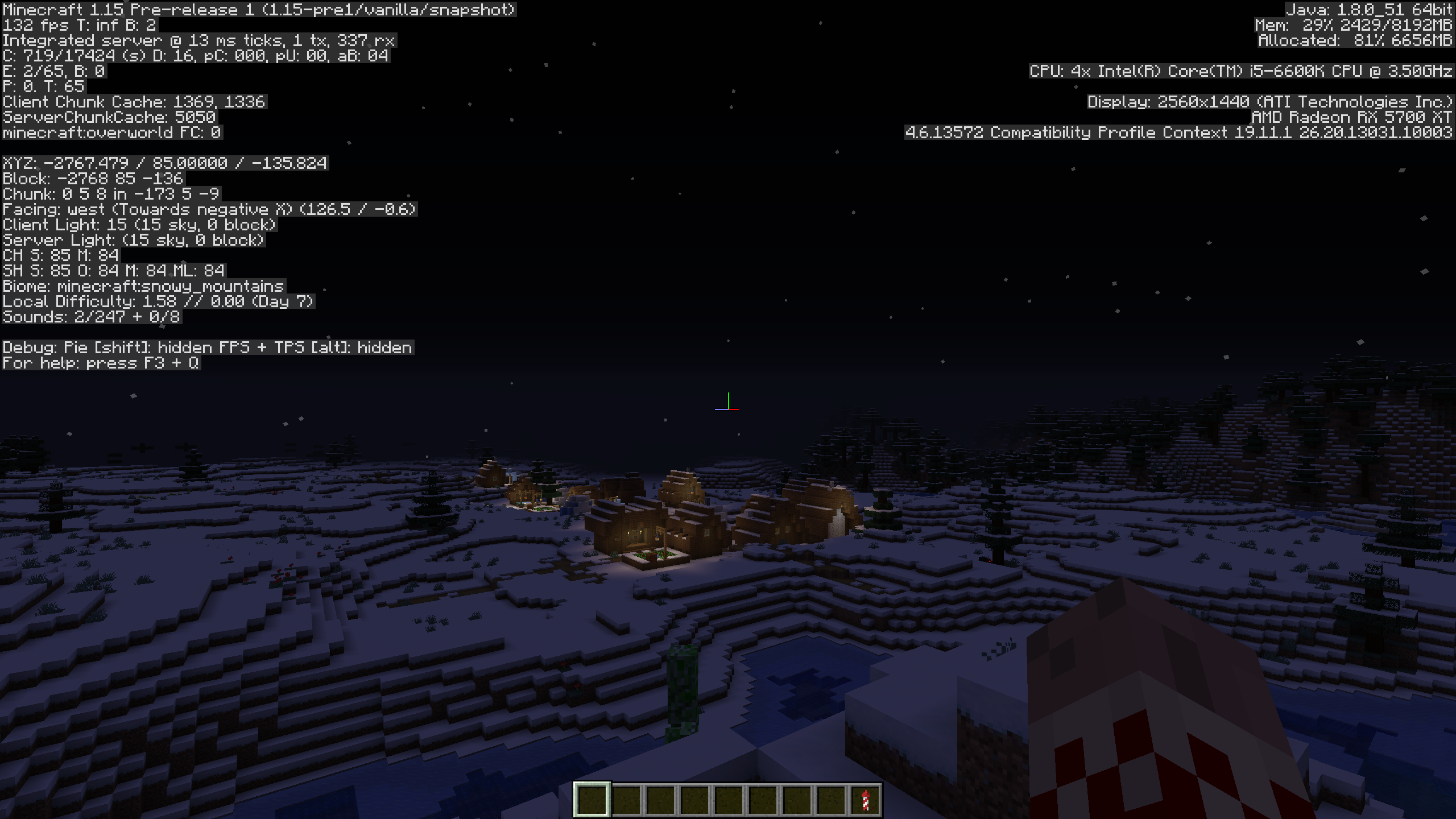 -then 1.15-pre1 with no tweaks or shenanigans, reusing the world from 1.14.4 due to the bugfixing of world generation resulting in different visuals in some places, want a 100% correlated test here within reason (villagers or mobs popping in sight). About 110FPS, 38%GPU utilization at 1395Mhz (which is 2D-mode clocks)