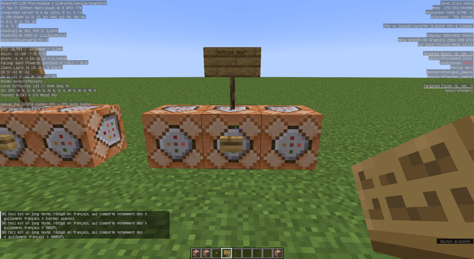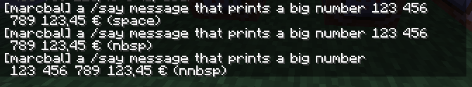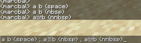Before the rendering issue was fixed, NBSP character was badly rendered in the chatbox, but rendered as a space in the message when sent (with line break behaviour). This suggests that NBSP was replaced by a regular space before rendering in chat. Even after the rendering fix (23w17a), NBSP sill acting as a regular space suggets that the NBSP->space replacement still occurs (this may be related to MC-94456).