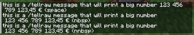 When used in chat messages, and in /say and /tellraw directly from the chatbox, the NBSP character does not act as intended (the line-breaking behaviour still occurs)