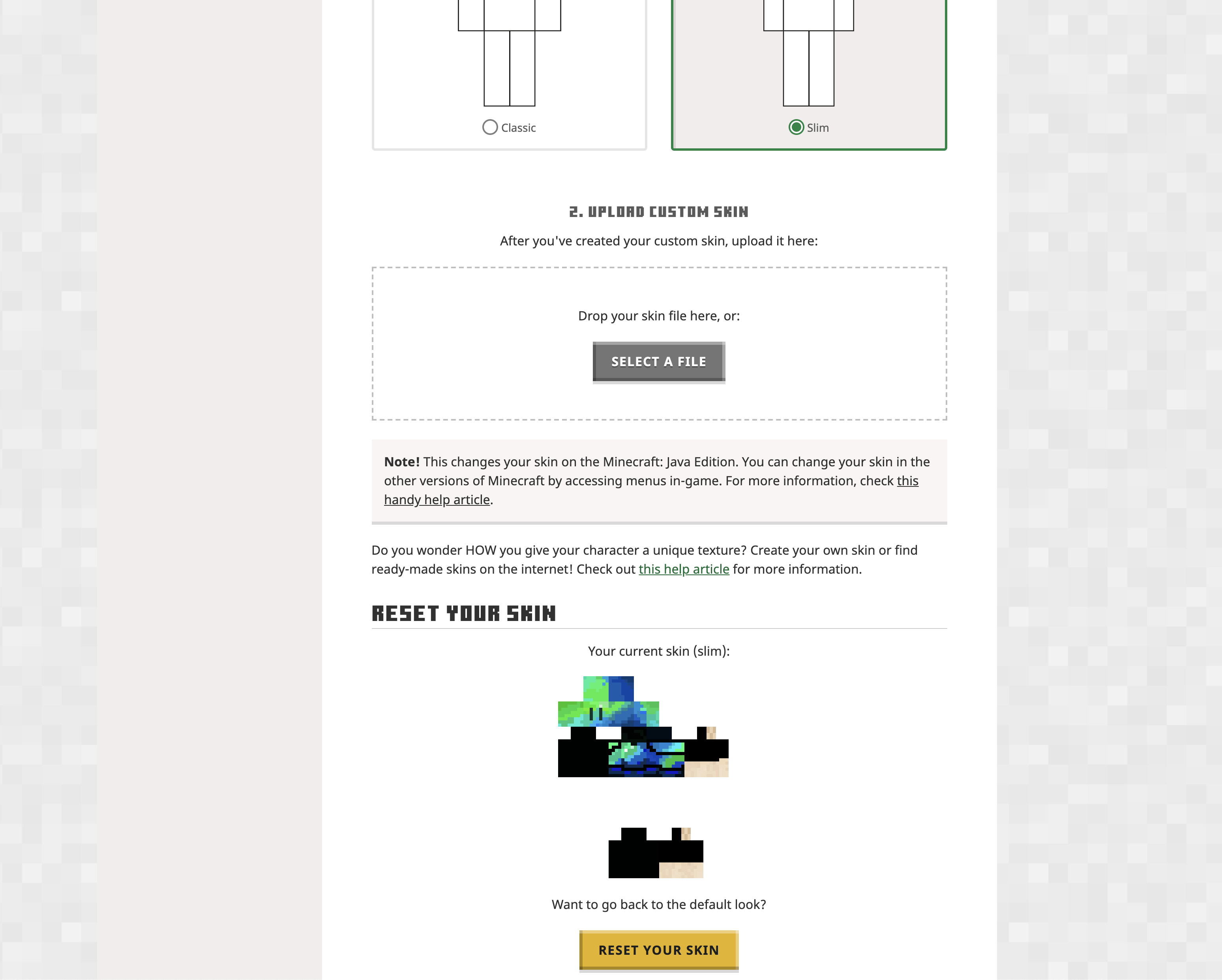 I want to start a minecraft video series but as it appears, I can't see my own custom skin I made myself using one of minecraft's trusty skin making applications. I tried logging on and off and even reloading but I still see myself as steve or alex preventing me from making my own unique videos. The problem was clear to me when others were able to see my custom skin design but I wasn't. I checked if others had similar problems so I could resolve mine but there wasn't any. I hope this could get fixed so I could get to recording since it's been weeks, I only gave it time because I read it takes time for my skin to appear but it's been far too long since I last changed the skin. It's really a pain because I paid for the game I really like and wanted to make my own video series but this bug is the only thing preventing it.