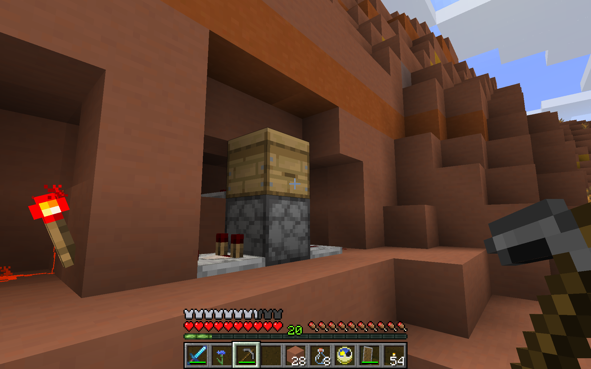 When the bees first entered and when I first noticed the issue, the hive was flanked and topped by terracotta blocks, which I removed later thinking it might free the bees, but to no avail. The front has been free all the time, even in front of the redstone components.