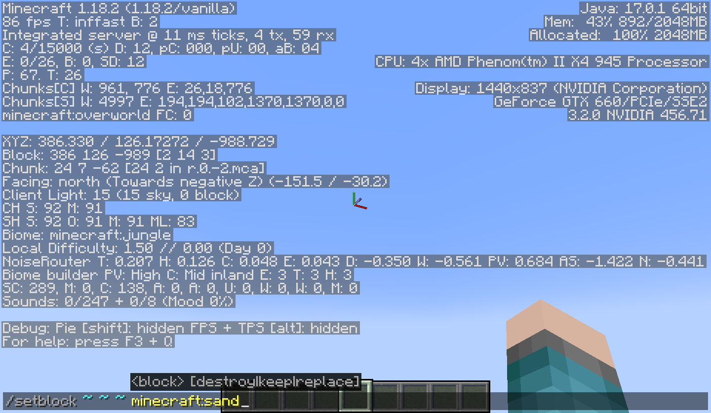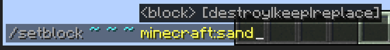 /setblock ~ ~ ~ sand❌ As soon as the "d" of "sand" is typed, no further suggestions ("sandstone", "sandstone_slab", ...) are shown and they cannot be tab completed either