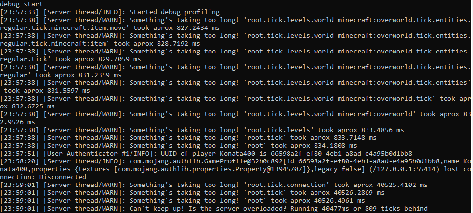 /debug start, wait a while and then run/debug stopin order to create a debug profile. Afterwards, run/debug report.If you do not have the permission to run these commands, open your world to LAN and enable cheats. If you're on a server, make sure that you're a server operator in order to execute these commands.