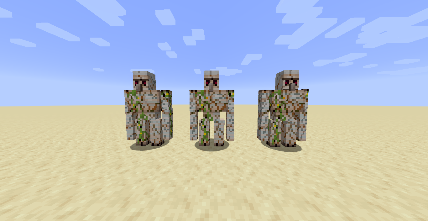 The crack textures for iron golems are broken, every crackiness level looks identical to the high crackiness texture as if the "crackiness high" texture is overlapping the "low and medium crackiness". This can be reproduced by hitting a golem 4 times with a diamond sword which causes the crackiness high texture to be displayed instead of the low crackiness texture.