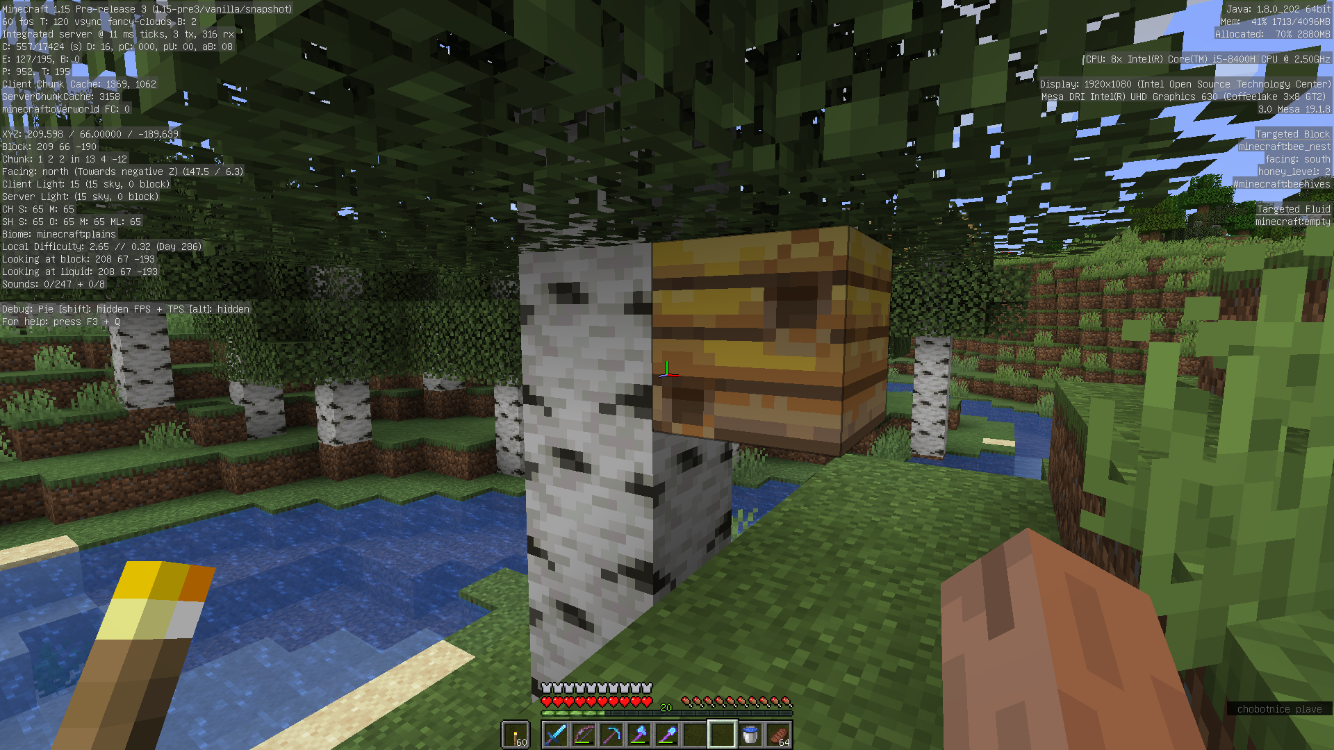 In my 1.15 test world I have two nests near to my base. In pre1 was bug MC-165173 fixed and bees finally start produce honey. But after upgrade to pre2 and later on to pre3, honey production stopped again and I can't see single bee in the world. I don't know, if they vanished or are in the nest.