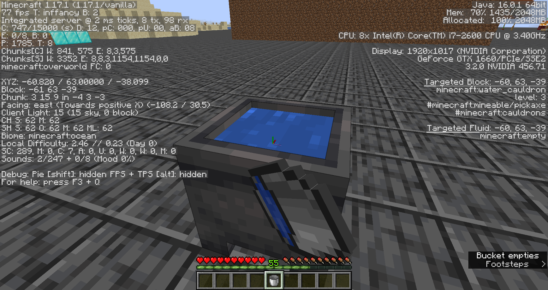 Right-clicking on a full water cauldron with a bucket of water plays hand animation and empties the bucket.