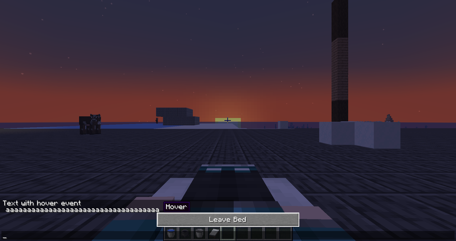 /tellraw @s {"text":"Text with hover event aaaaaaaaaaaaaaaaaaaaaaaaaaaaaaaaaaaa","hoverEvent":{"action":"show_text","value":"Hover"},"clickEvent":{"action":"run_command","value":"/say Clicked"}}Enter the bed