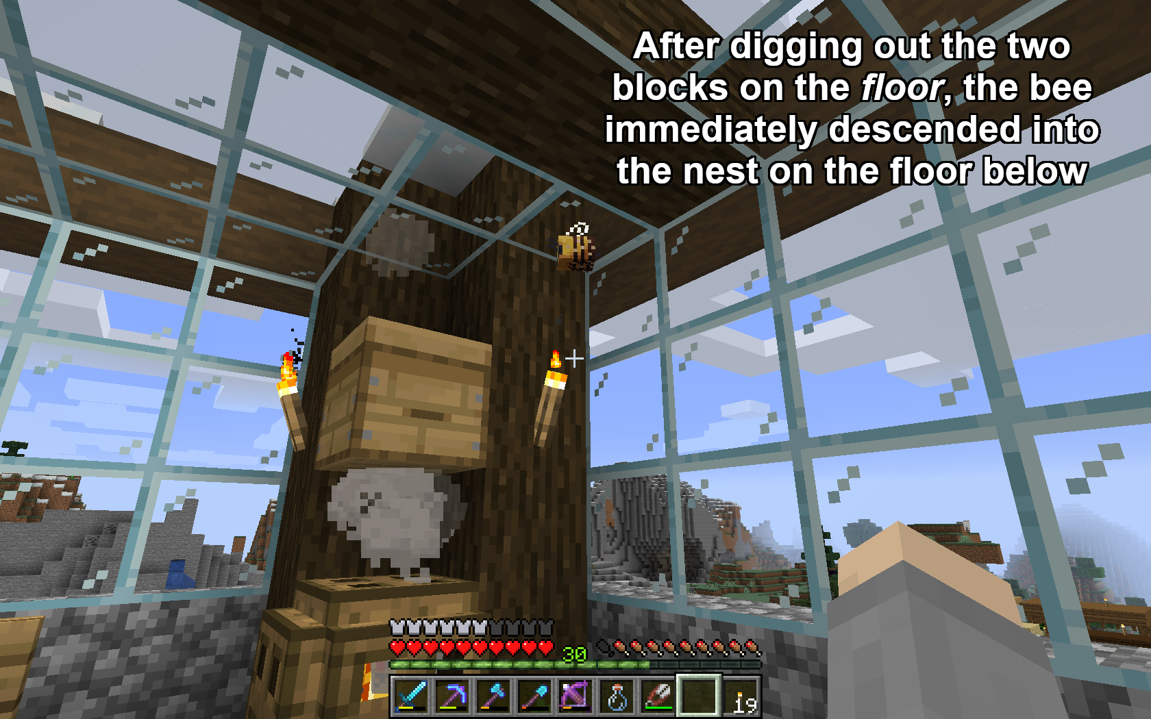 Bees attempt to navigate to flowers and nests through solid ground (full blocks).