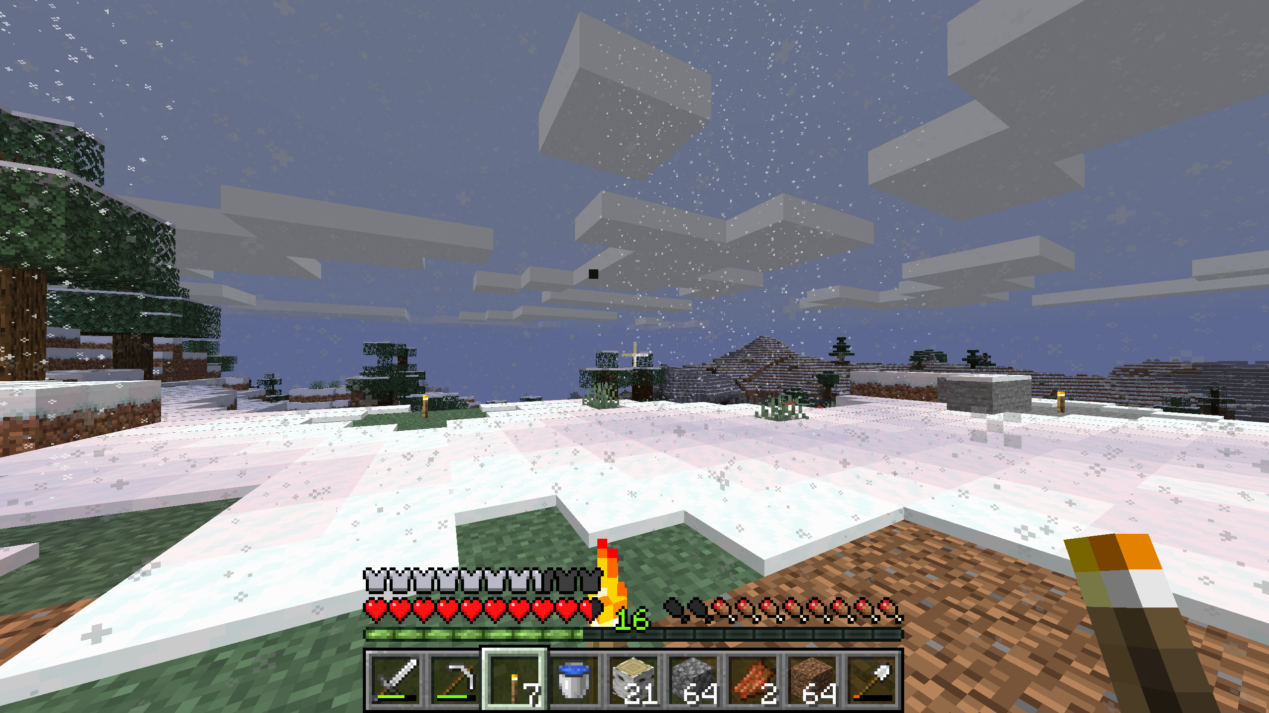 The light from torches makes snowflakes darker, while any snowflakes not within range of a torch are bright. Seems like the lighting effect is applied backwards or something. As you can see in the attached screenshot, the snowflakes between the two torches are bright, whereas the ones directly near the torches are dark.